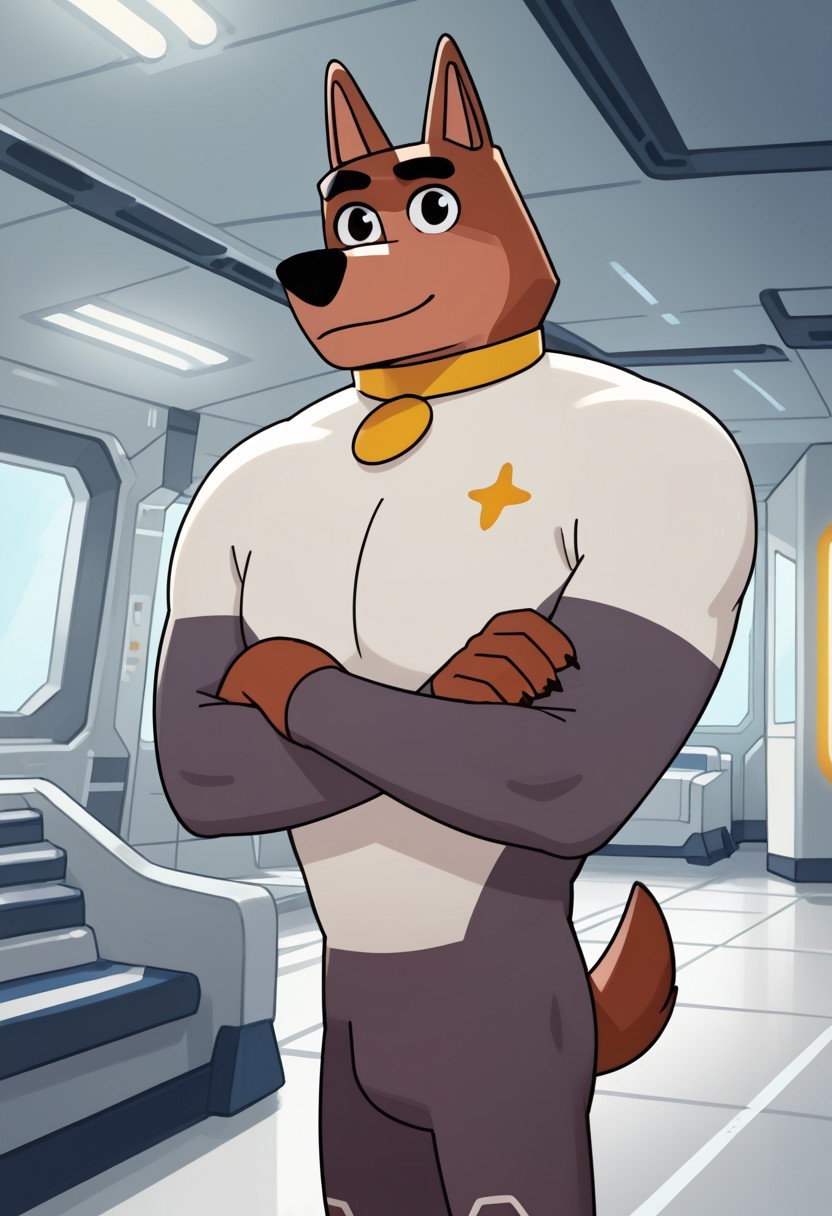 brown fur, black eyes, black eyebrows, dog ears, dog nose, big nose, black nose, dog tail, small tail, four fingers on arms, muscular