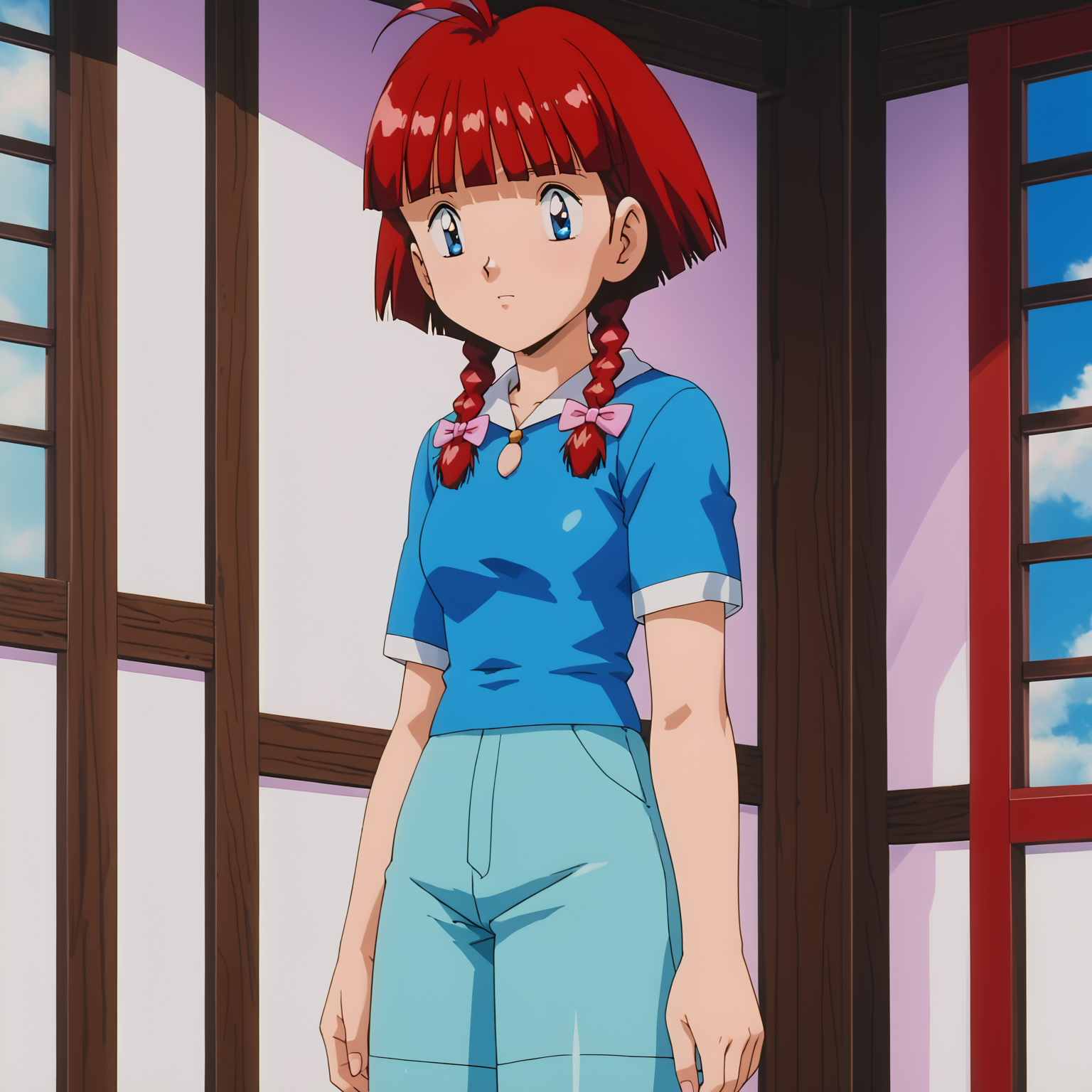 pkmkay, twin braids, blue eyes, bow, bangs, red hair, hair bow, blunt bangs, shorts, shirt, short sleeves