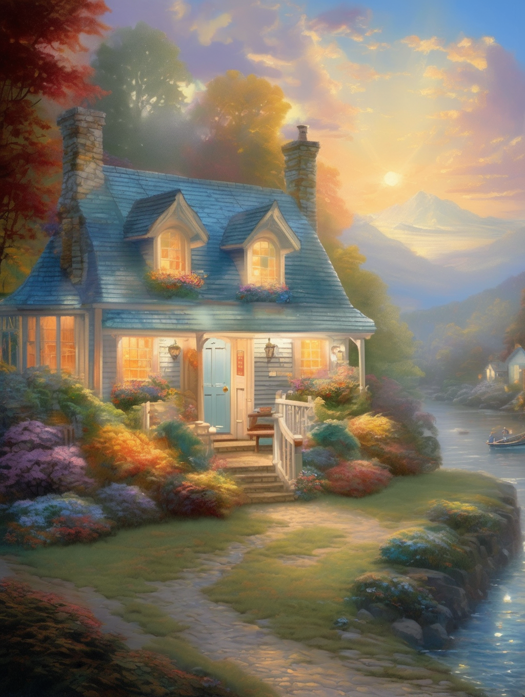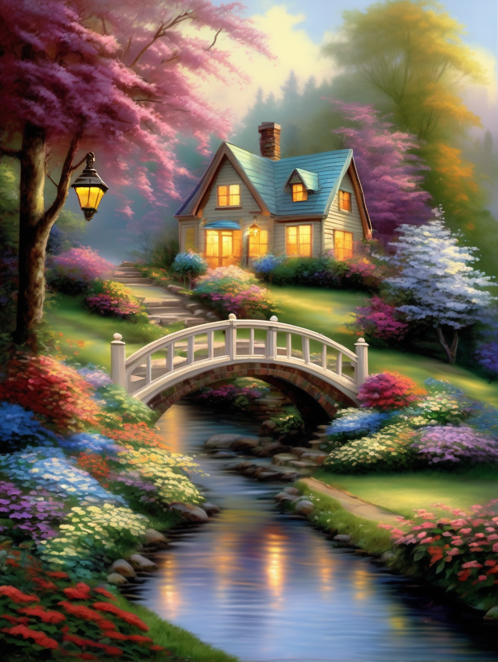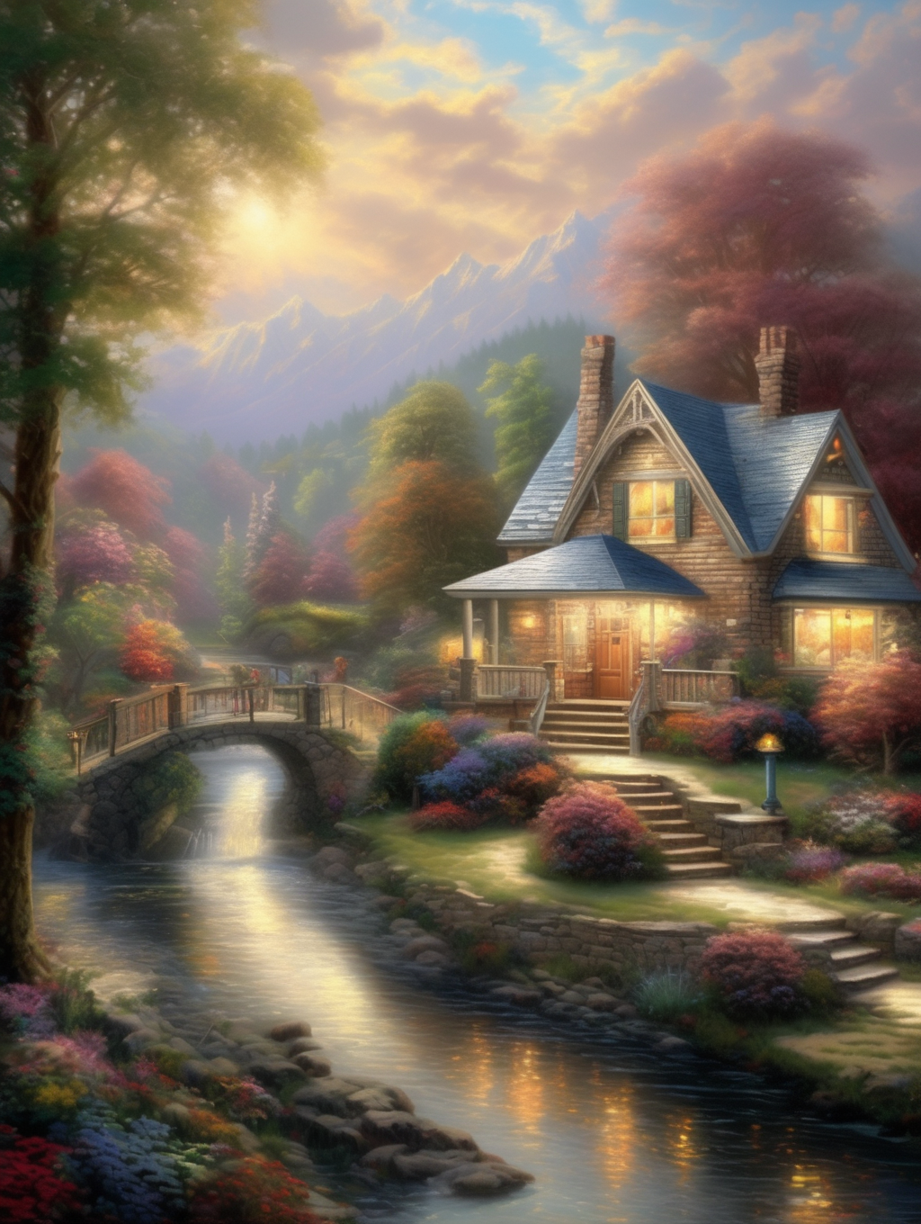 Kinkade's style is characterized by its emphasis on warm, glowing light, vibrant colors, and a sense of tranquility. His paintings often portray serene landscapes, charming cottages, and inviting scenes that evoke a nostalgic and idealized vision of rural life.