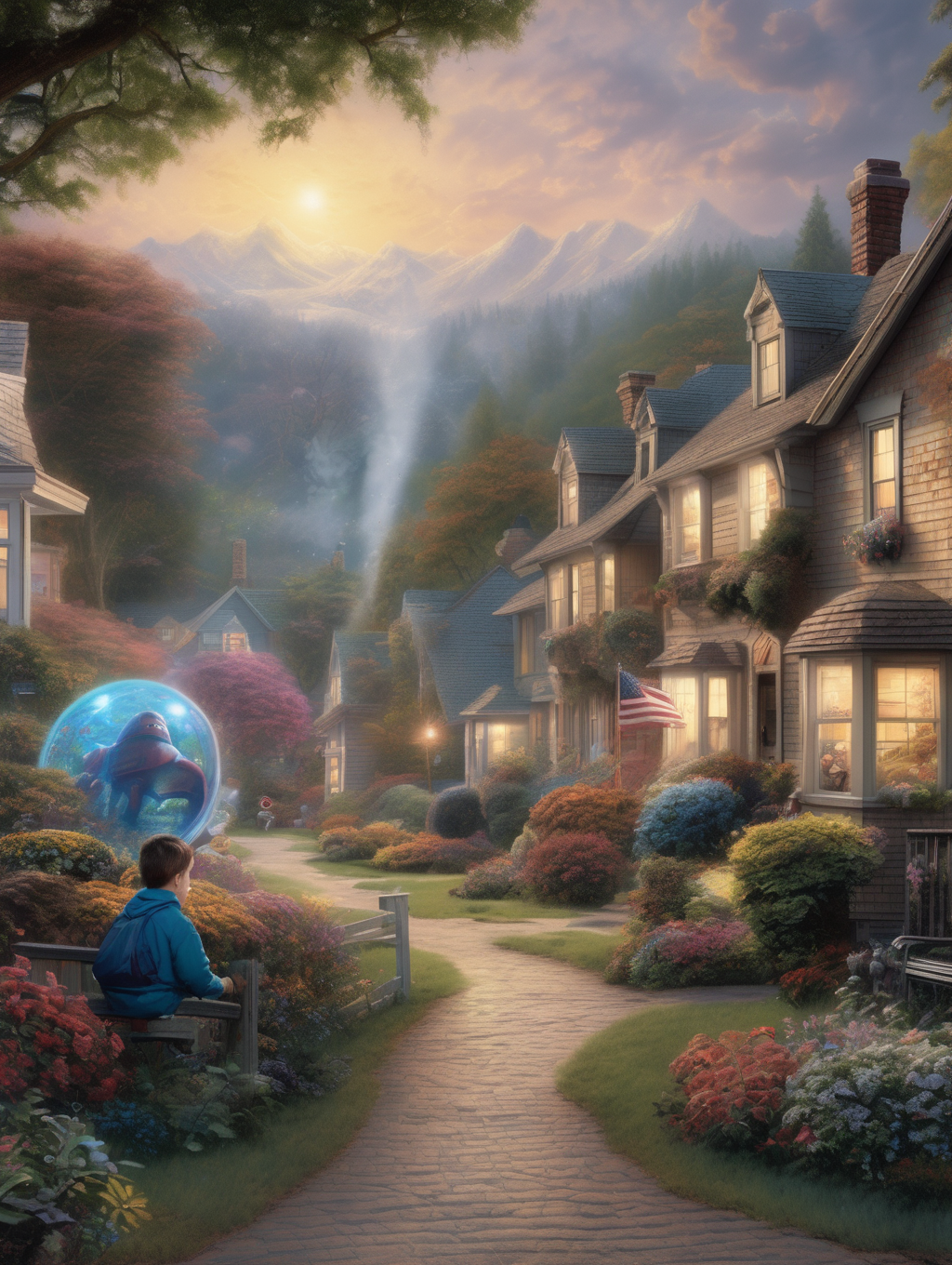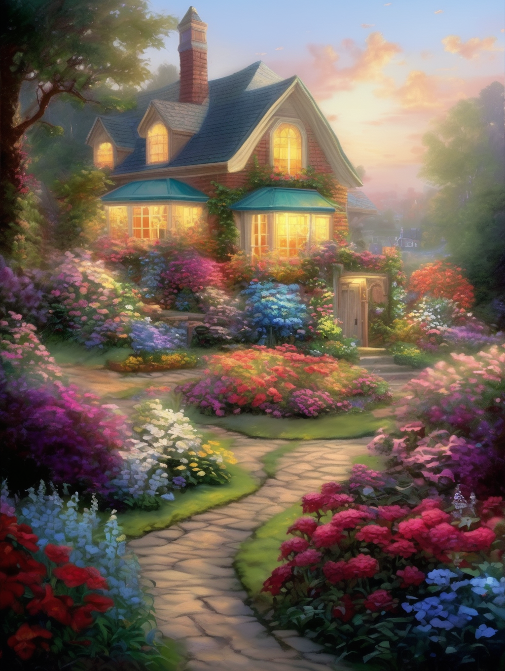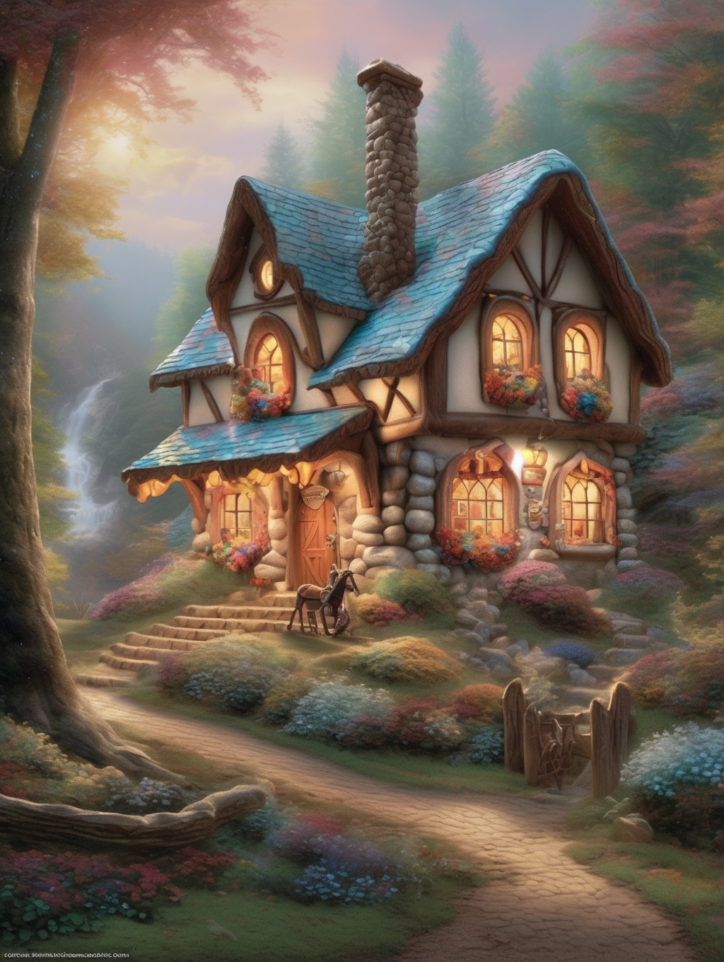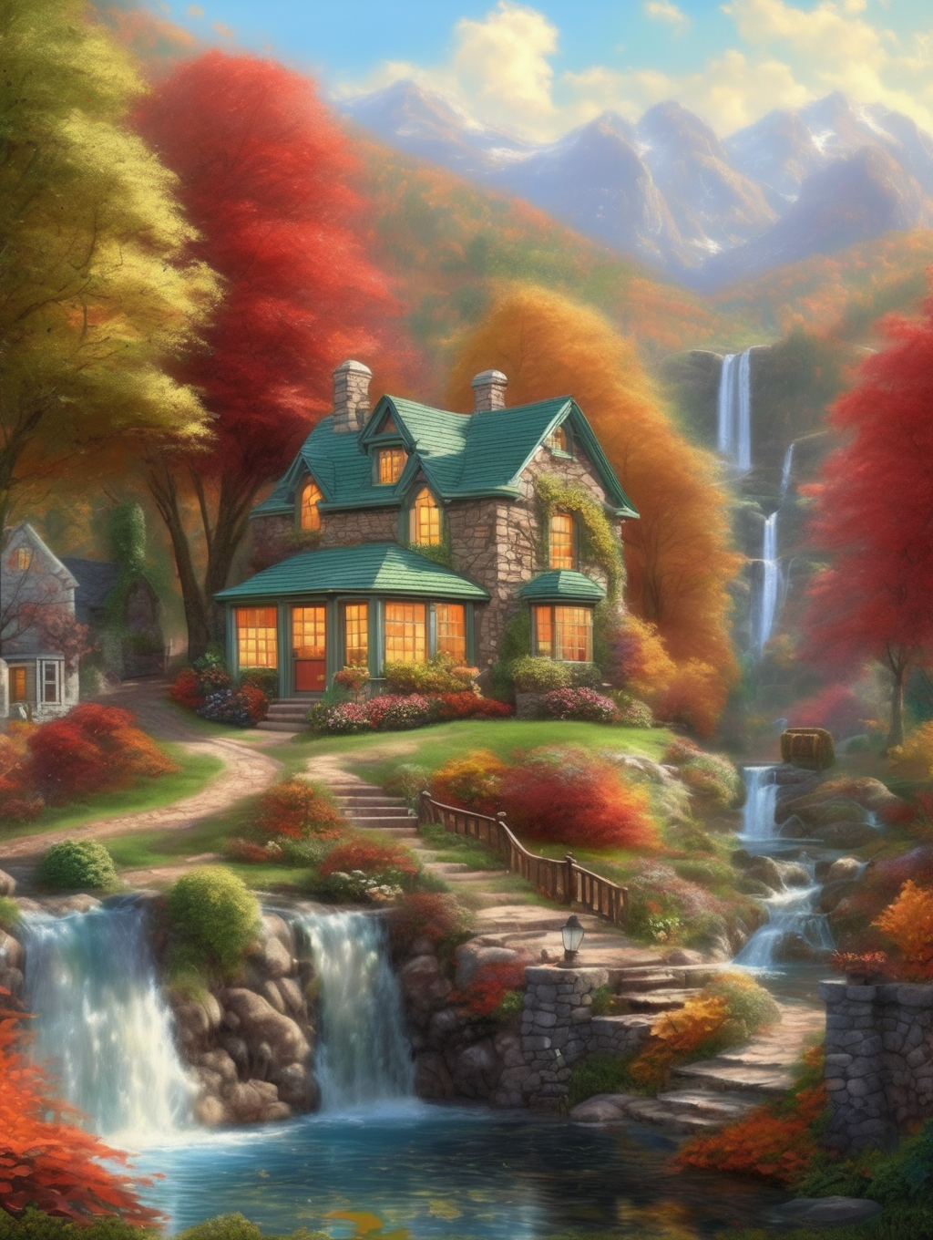 Kinkade's style is characterized by its emphasis on warm, glowing light, vibrant colors, and a sense of tranquility. His paintings often portray serene landscapes, charming cottages, and inviting scenes that evoke a nostalgic and idealized vision of rural life.