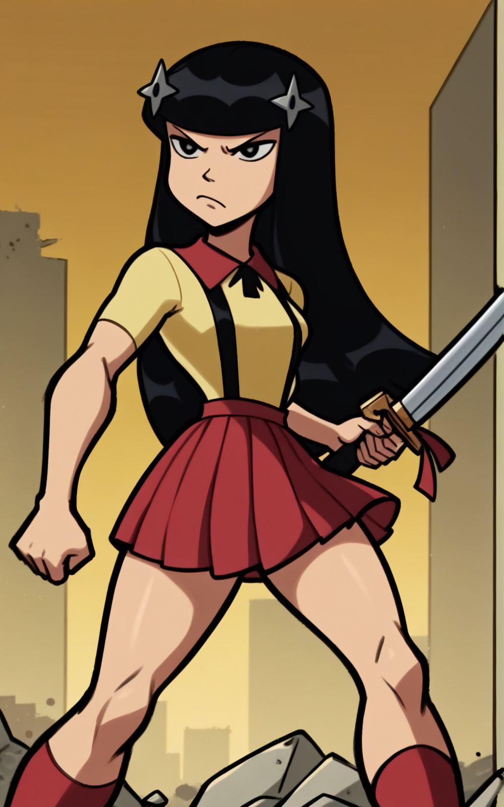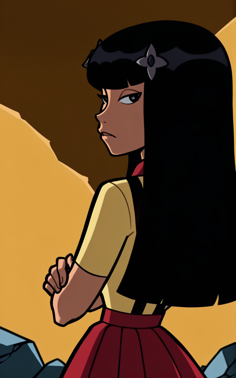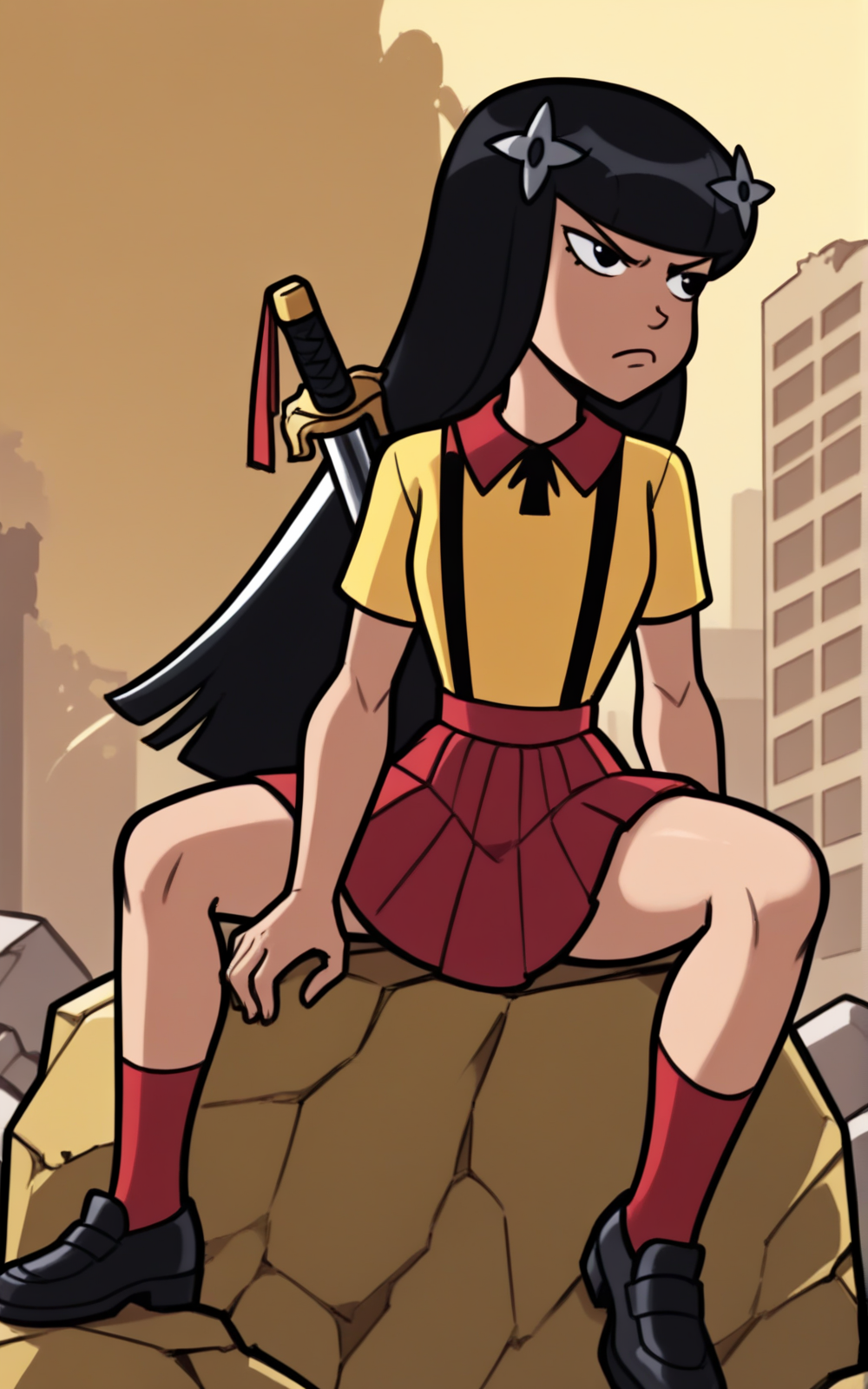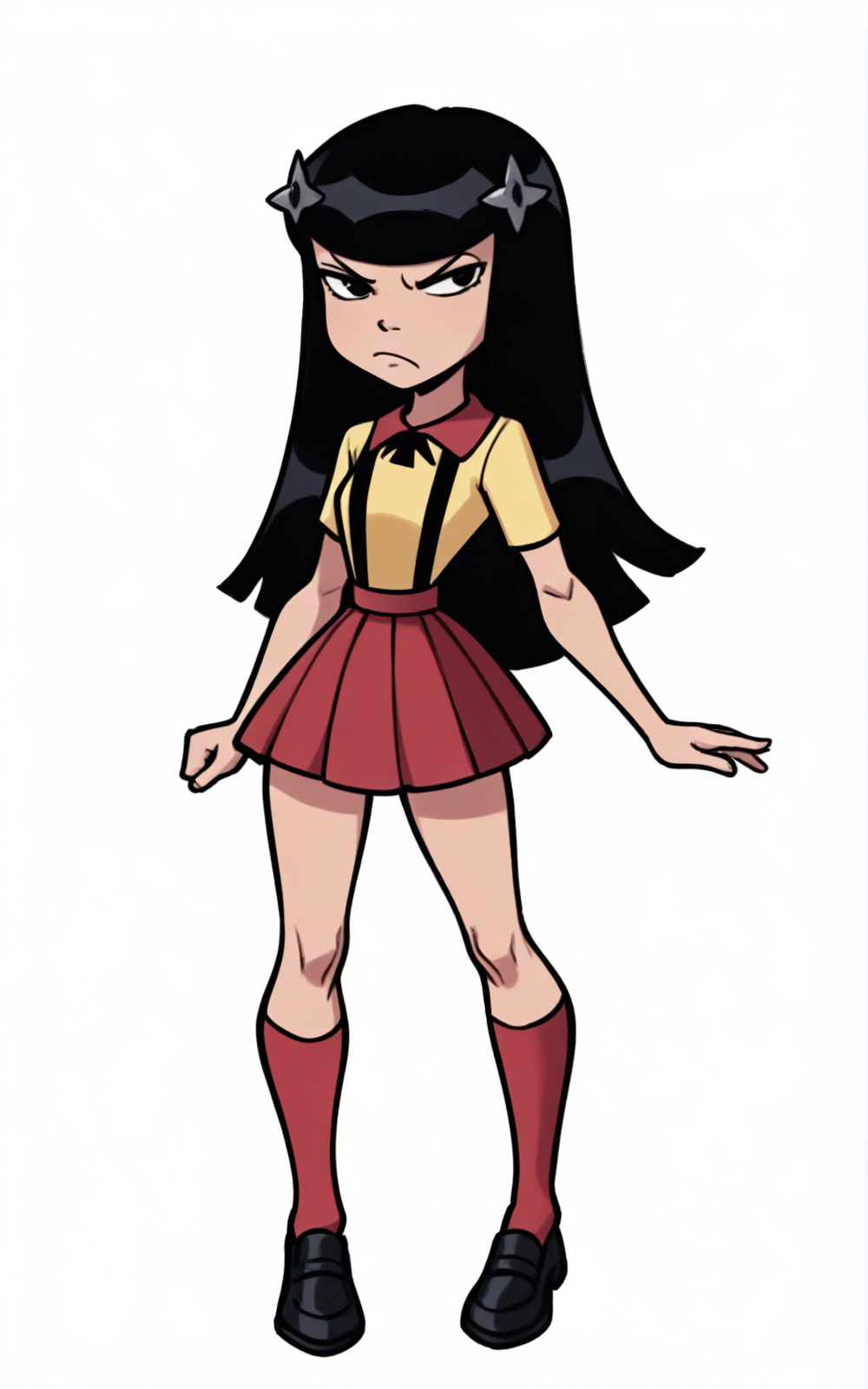 For her Outfit: short sleeves, skirt, red skirt, yellow shirt, collared, suspenders, suspender skirt, pleated skirt, red socks, socks, black footwear