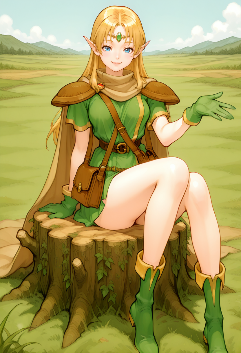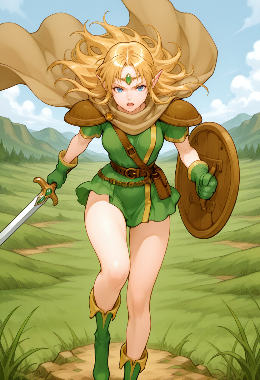 d&d_elf, pointy ears, blue eyes, blonde hair, long hair, circlet, forehead jewel, shoulder armor, green gloves, green dress, cape, shoulder bag,