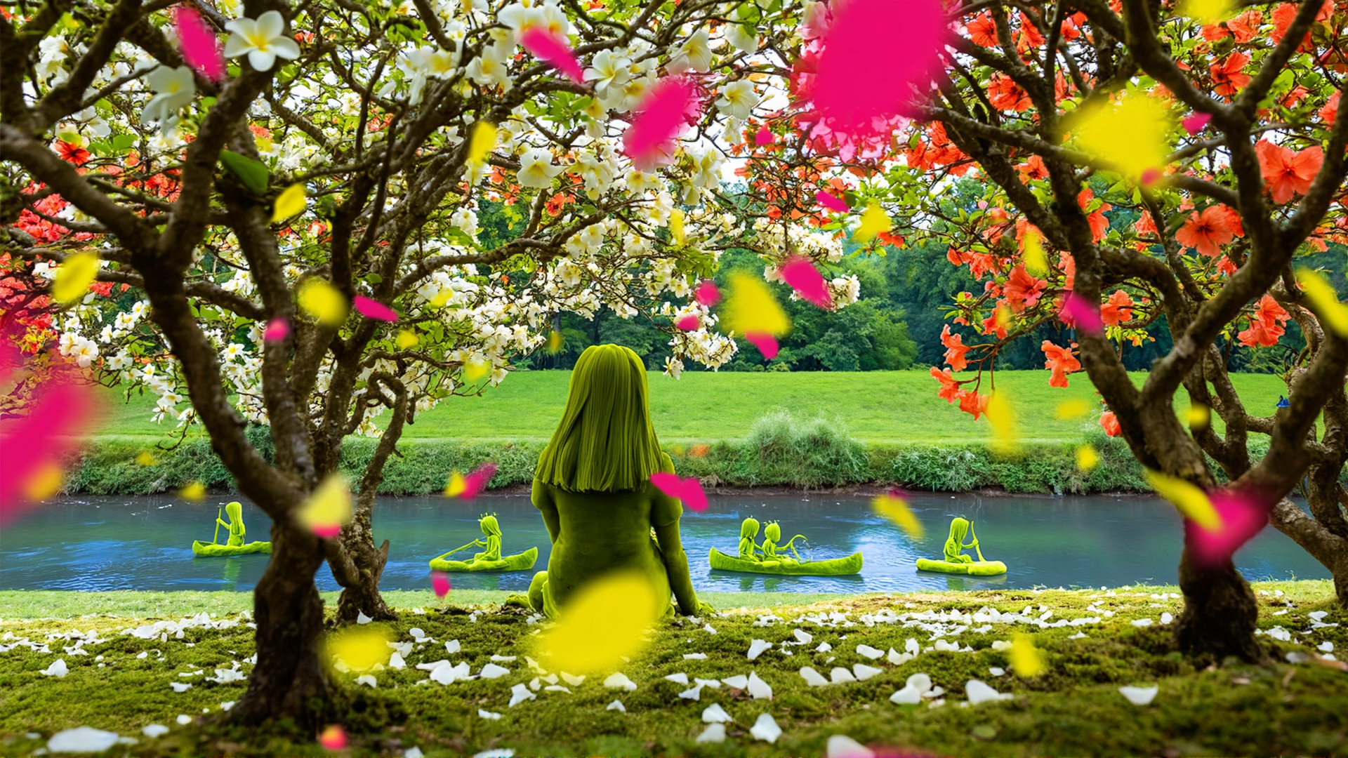 A MossPeople woman sits on an old stone bench