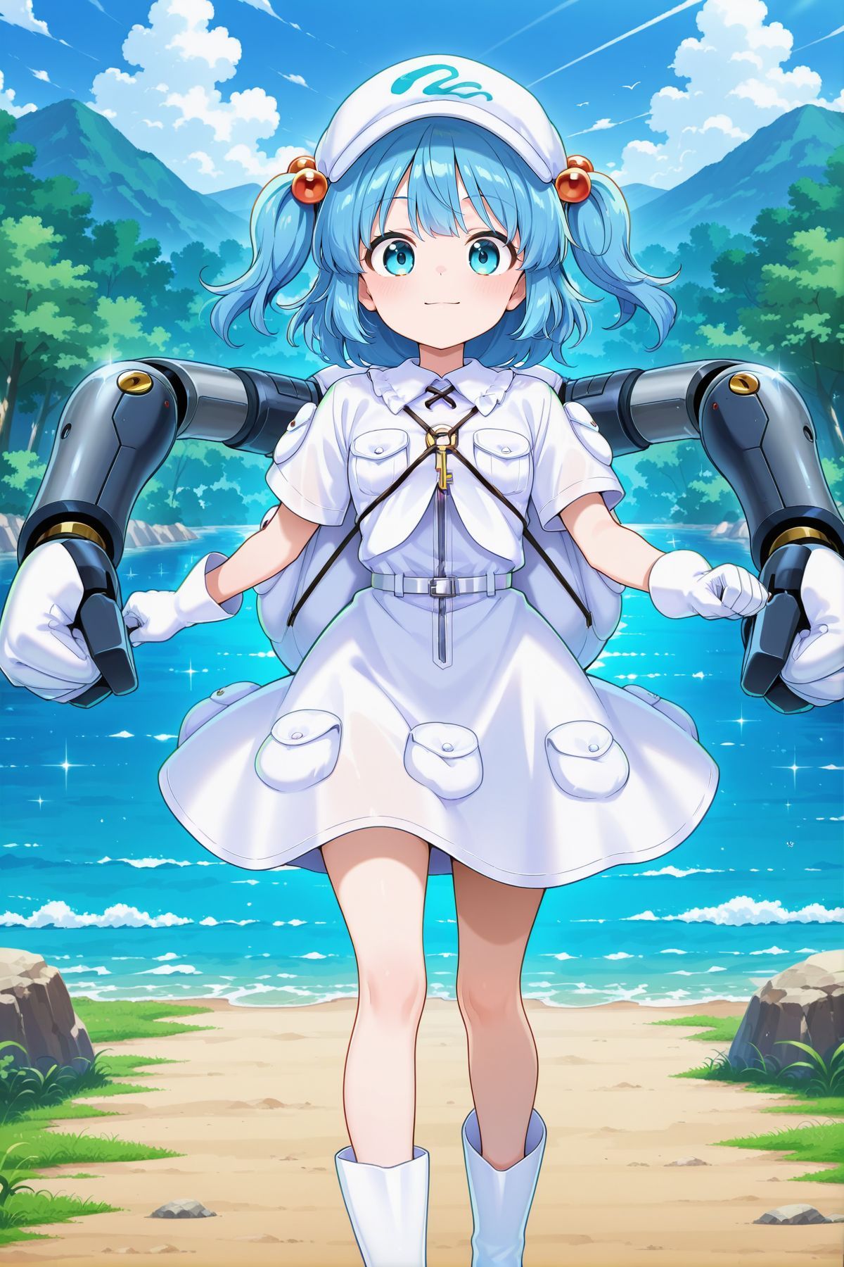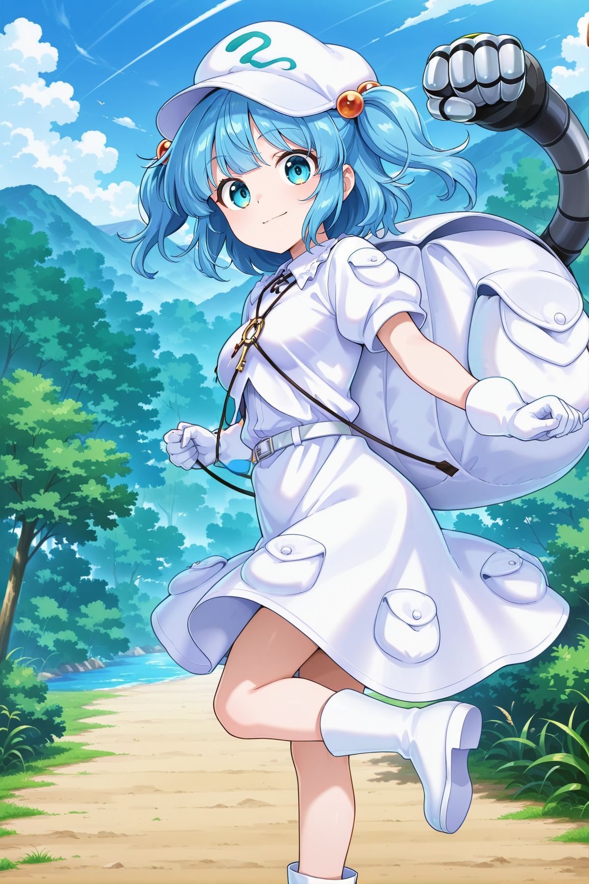 kawashiro nitori, 1girl, solo, blue eyes, blue hair, medium hair, two side up,, kawashiro nitori \(white kappa of pristine water\), alternate color, alternate headwear color, white hat, flat cap, hair bobbles, orange bobbles, white dress, short sleeves, key, pocket, white belt, white gloves, white boots, white bag, mechanical arms,