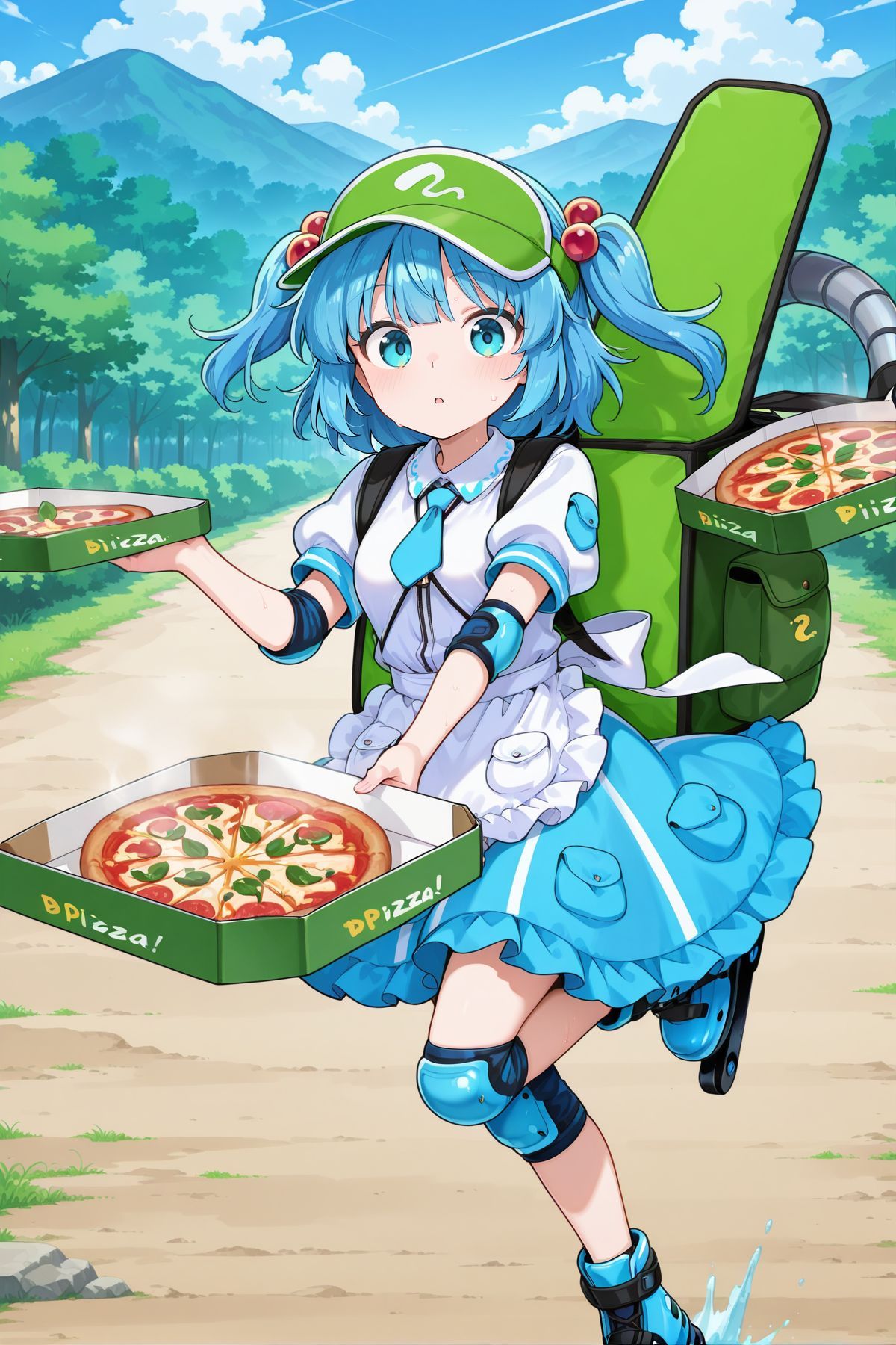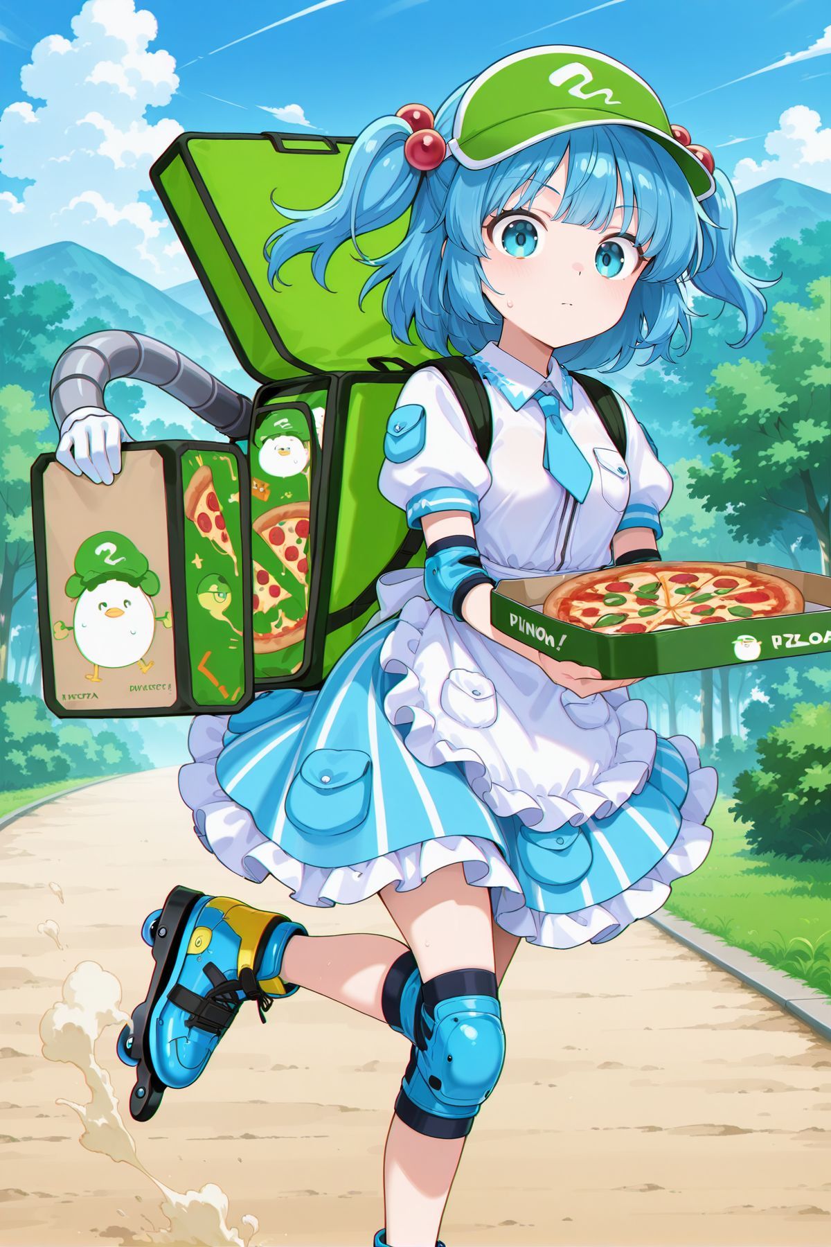 kawashiro nitori, 1girl, solo, blue eyes, blue hair, short hair, two side up, blunt bangs, blunt ends,, kawashiro nitori \(hot pizza delivery\), alternate costume, green hat, visor cap, hair bobbles, red bobbles, blue necktie, short necktie, collared shirt, white shirt, puffy short sleeves, waist apron, white apron, frilled apron, vertical-striped skirt, blue skirt, white skirt, frilled skirt, elbow pads, knee pads, blue pads, inline skates, roller skates, blue boots, green backpack, insulated delivery bag, mechanical arms,