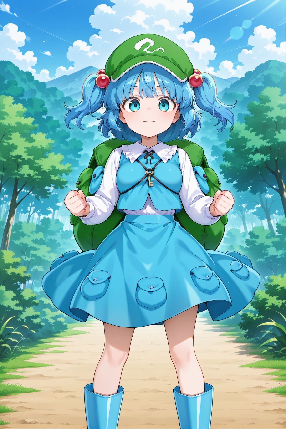 kawashiro nitori, 1girl, solo, blue eyes, blue hair, short hair, two side up, kawashiro nitori \(faith\), adapted costume, green hat, mob cap, hair ornament, hair bobbles, blue vest, white shirt, blue skirt, pocket, rubber boots, green backpack,