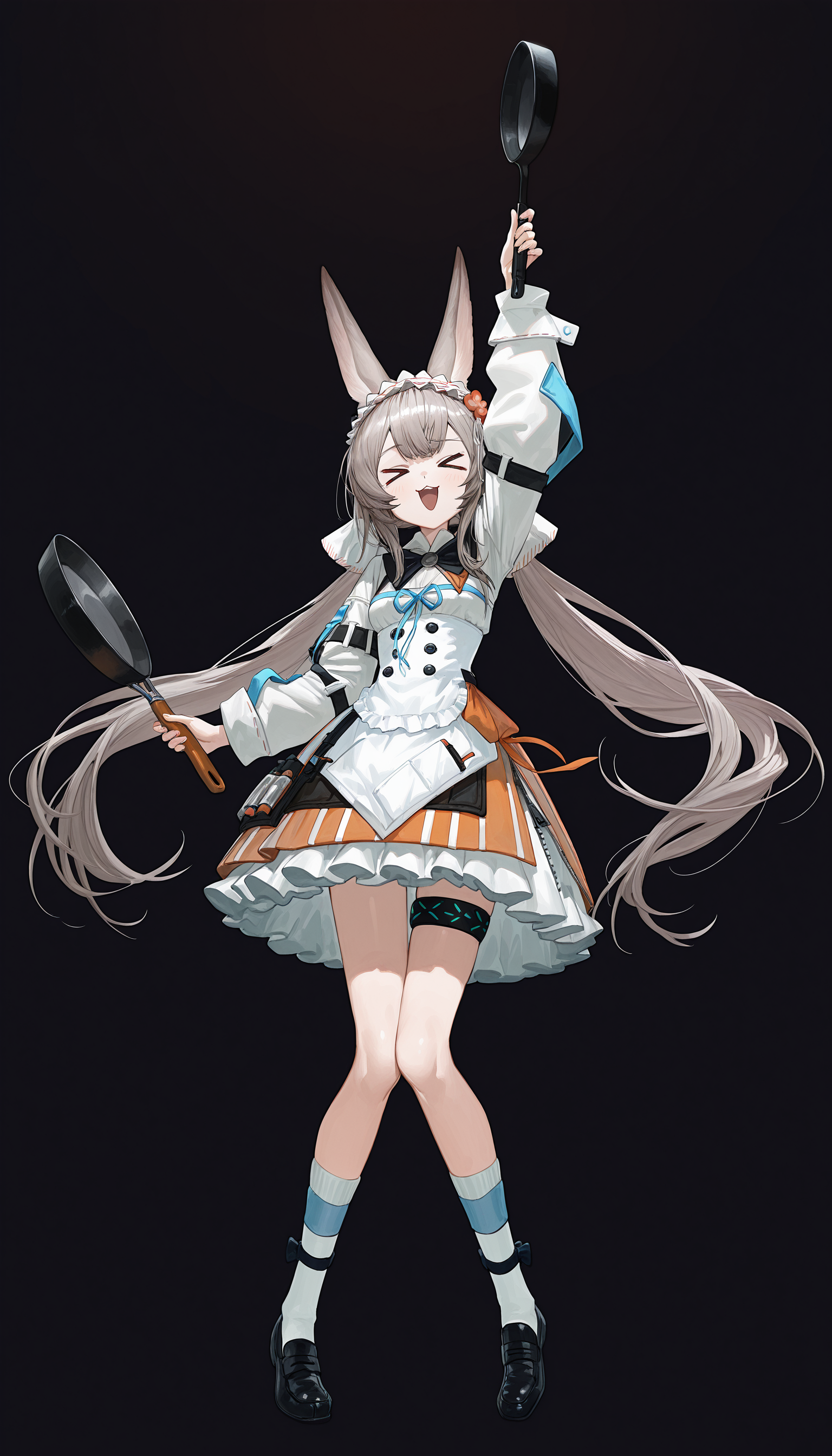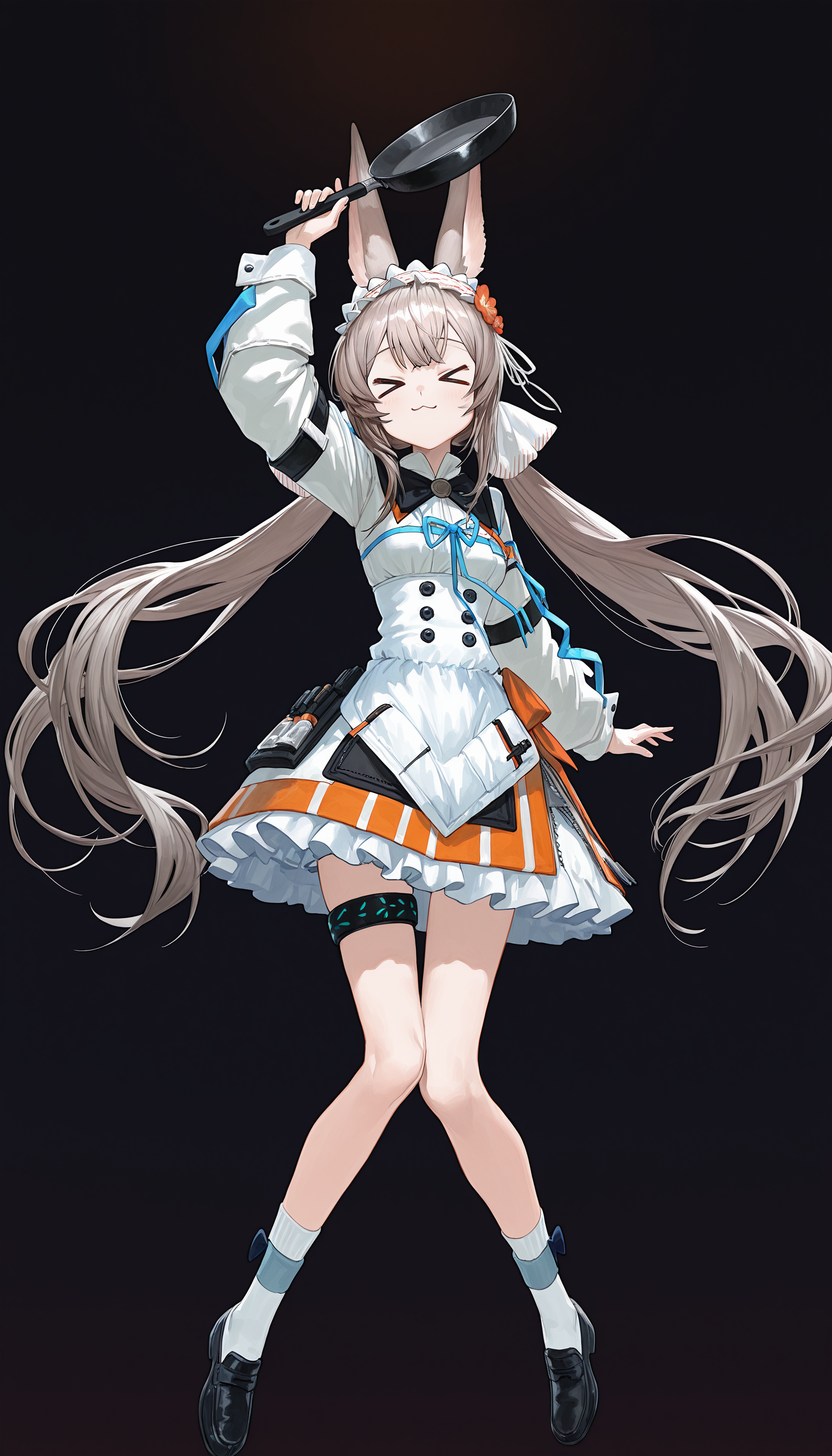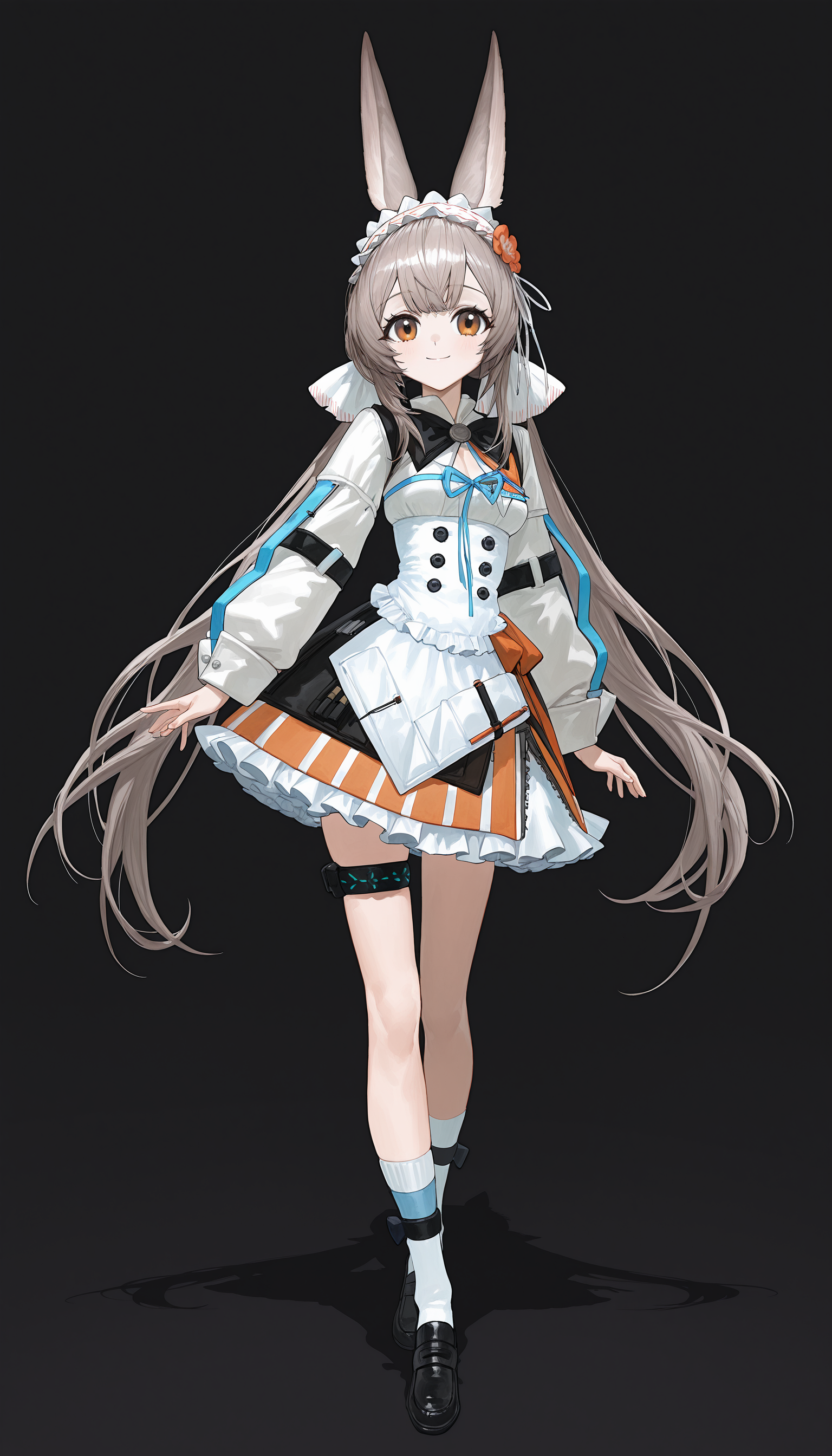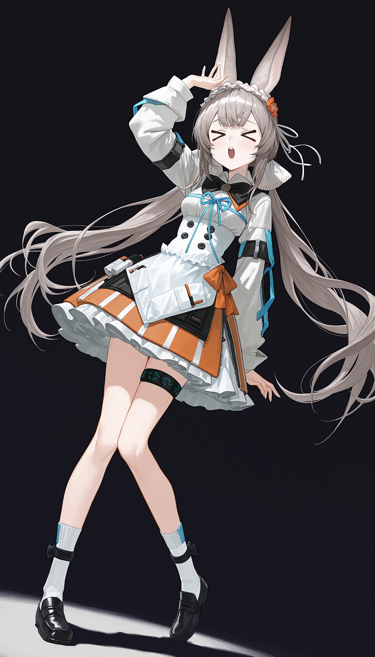 warmy_\(arknights\), low twintails , bow , grey hair, brown eyes , hair flower , hairband , white dress , white socks , puffy long sleeves , thigh strap , white apron, loafers ,