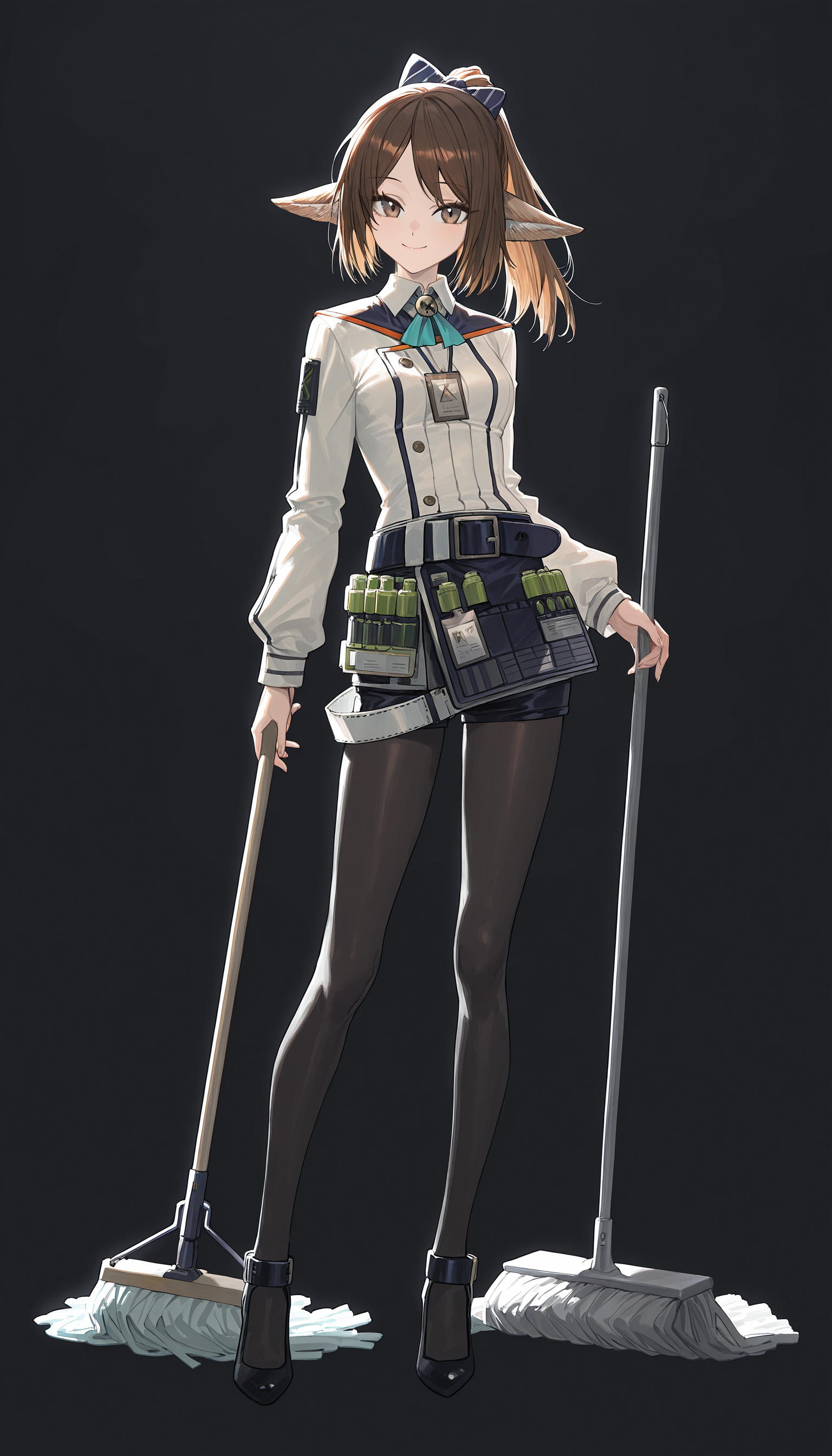 perfumer_\(species_plantarum\)_\(arknights\), brown hair , ponytail , hair bow , brown eyes , collared shirt ,black pantyhose , belt , id card , black shorts , holding mop,