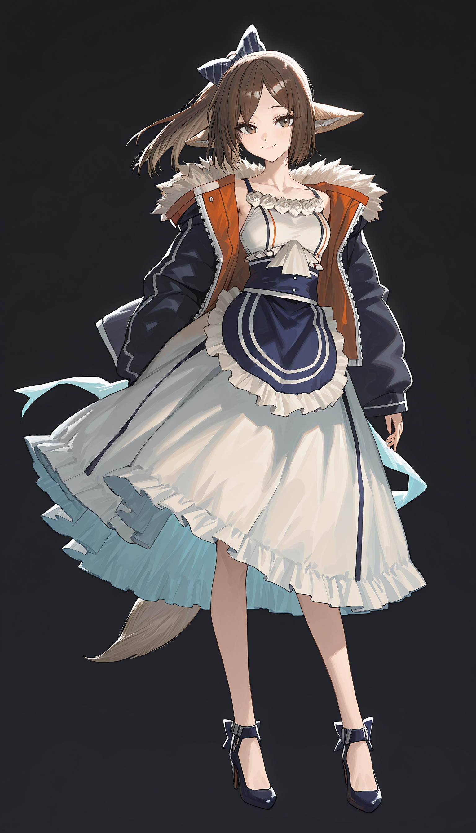 perfumer_\(arknights\), brown hair , ponytail , hair bow , brown eyes , open jacket, fur-trimmed jacket , sleeveless dress , blue apron, high heels ,
