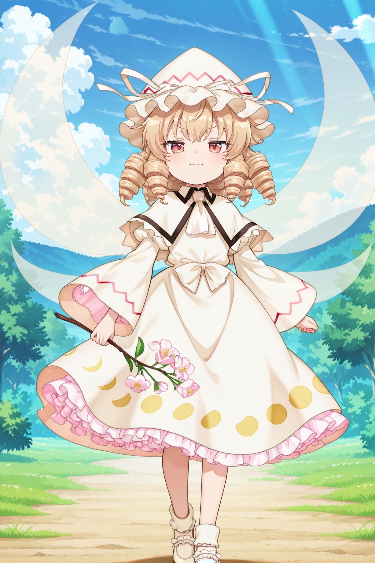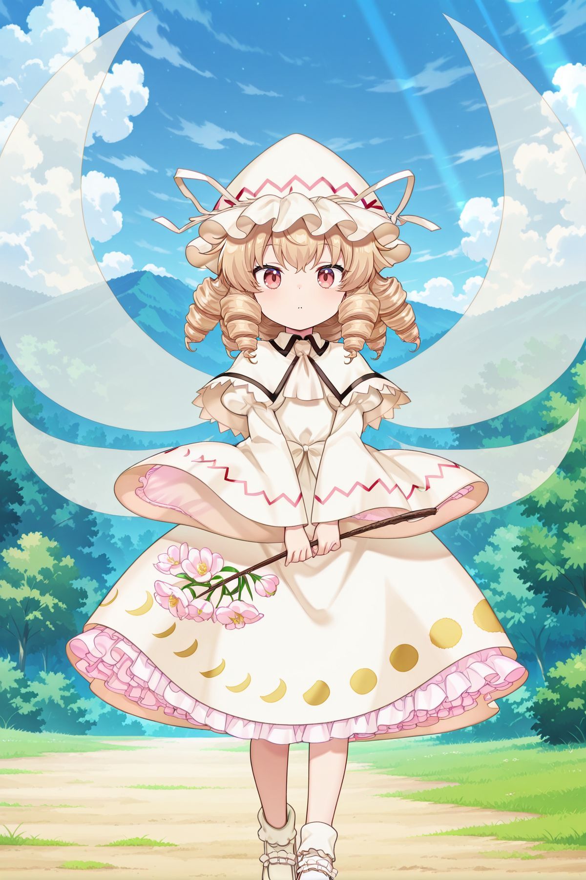 luna child, 1girl, solo, pink eyes, blonde hair, long hair, drill hair, drill sidelocks, fairy, fairy wings,, luna child \(youkai the quiet moonlight\), alternate costume, lily white (cosplay), white hat, hat ribbon, white ribbon, white capelet, white ascot, white dress, print dress, moon print, long sleeves, wide sleeves, petticoat, white socks, white shoes, holding branch,