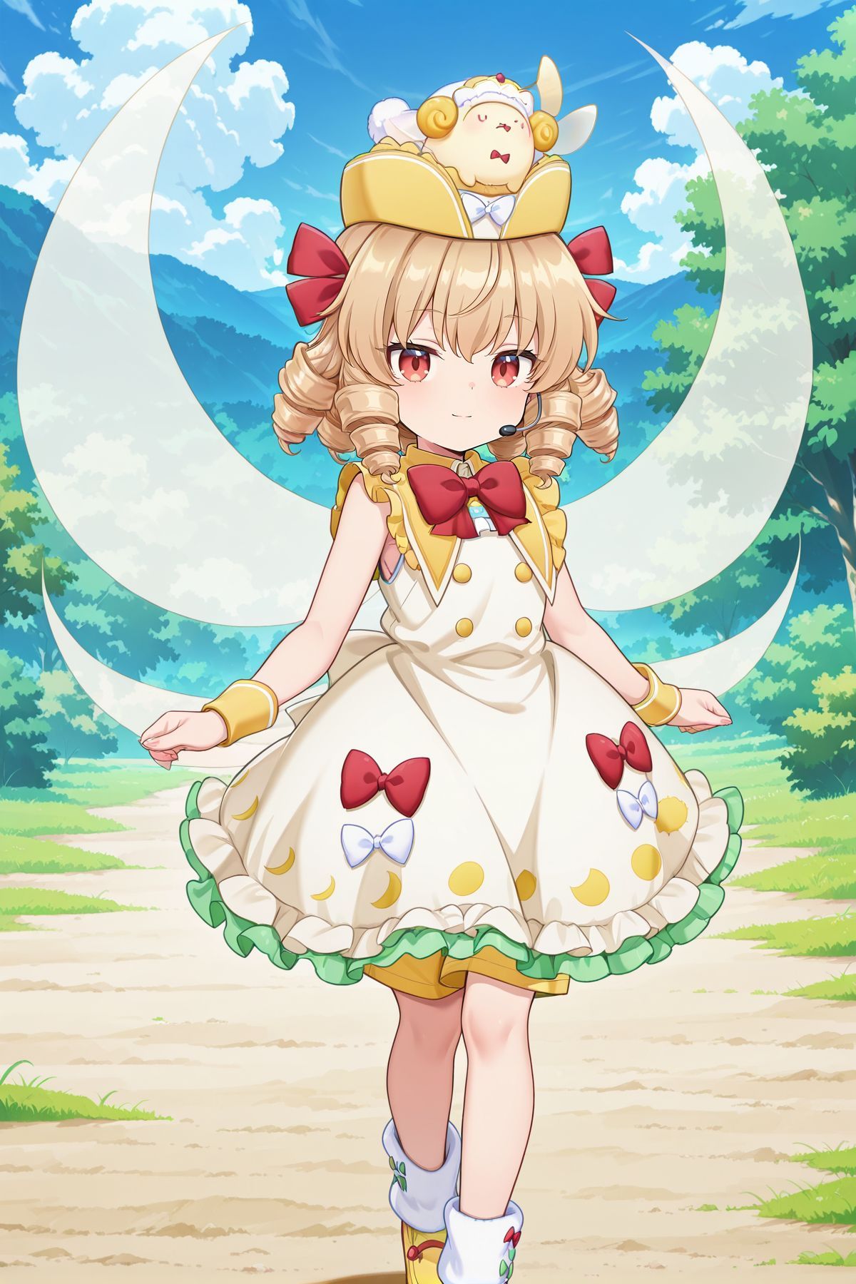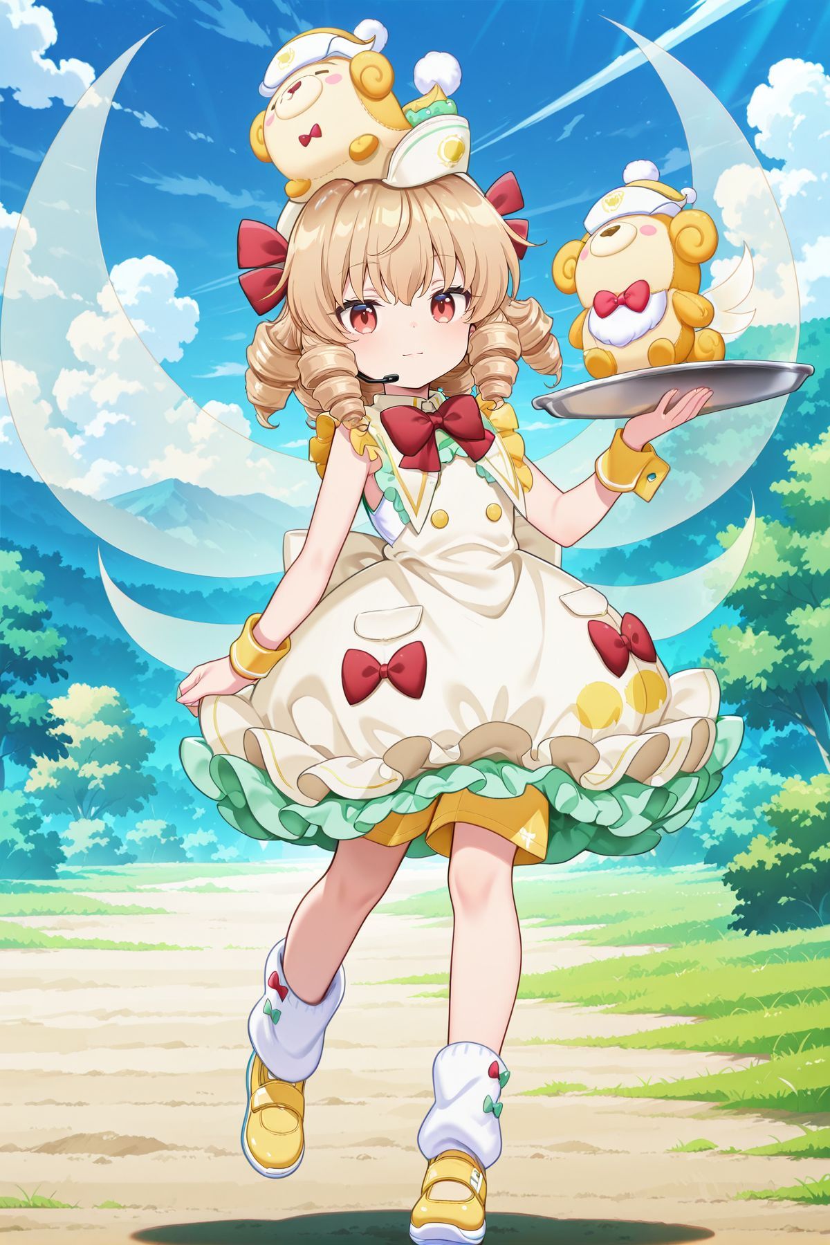 luna child, 1girl, solo, red eyes, blonde hair, medium hair, drill hair, drill sidelocks, fairy, fairy wings, luna child \(moonlight menu\), alternate costume, alternate headwear, yellow hat, flight attendant hat, hair bow, red bow, headset, red bowtie, white dress, frilled dress, sleeveless dress, dress bow, wrist cuffs, shorts under dress, yellow shorts, white leg warmers, two-tone shoes, yellow shoes, red shoes, holding tray, stuffed toy,
