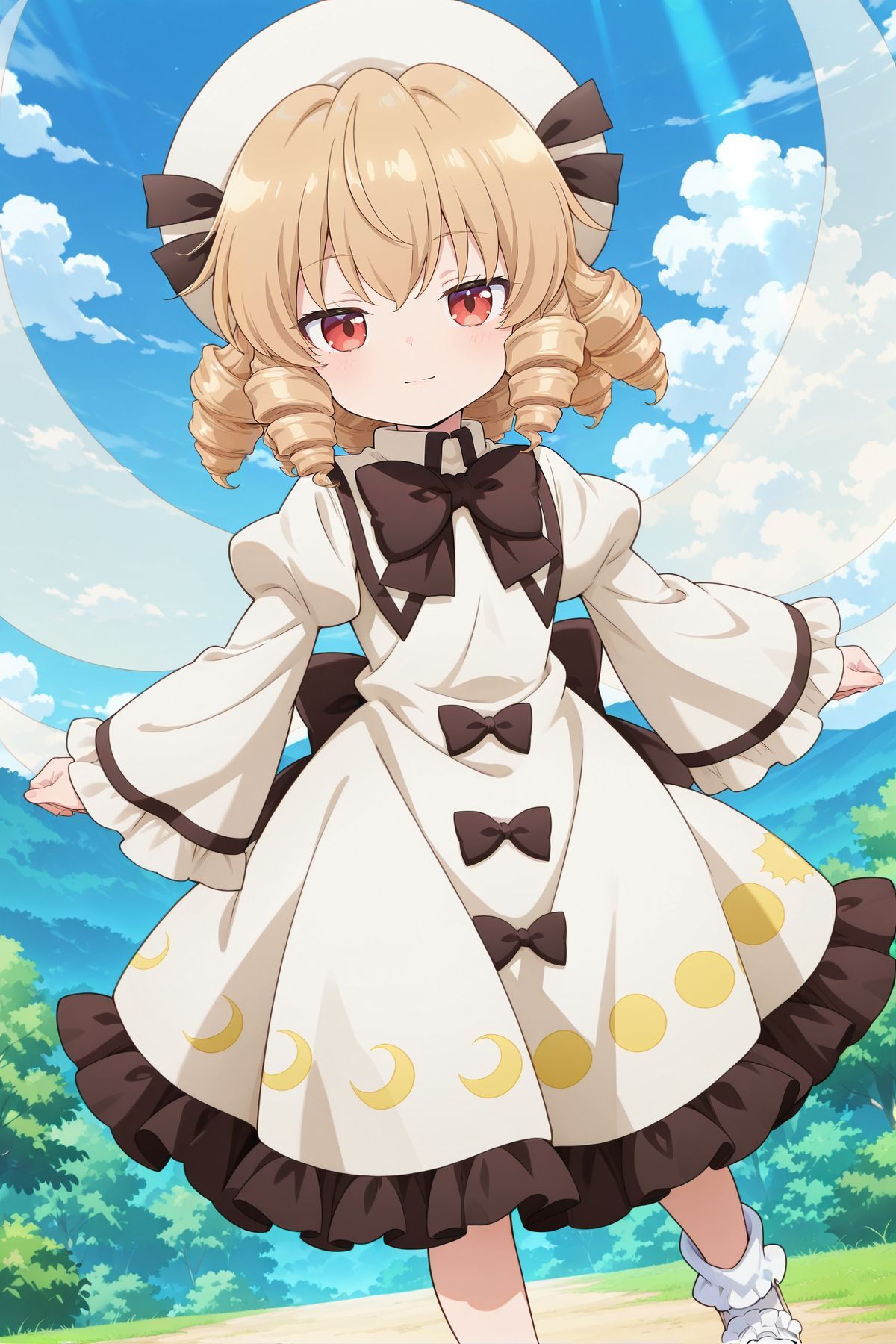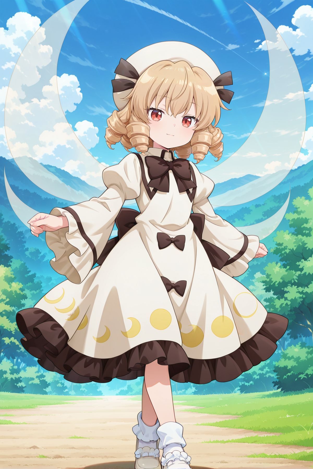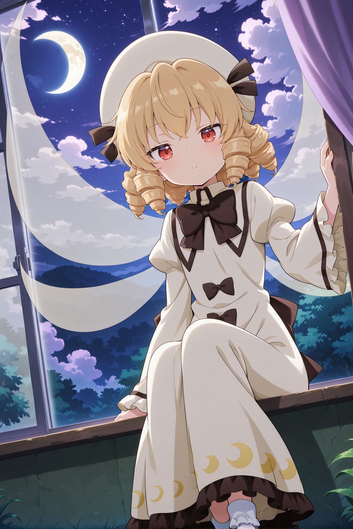 white headwear, hair ribbon, black ribbon, black bowtie, white dress, frilled dress, long sleeves, wide sleeves, dress bow, back bow, black bow, moon print, white socks, white shoes,