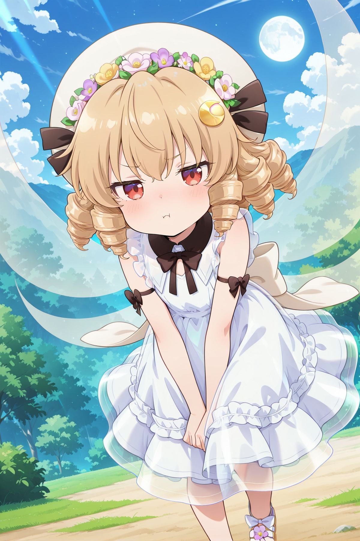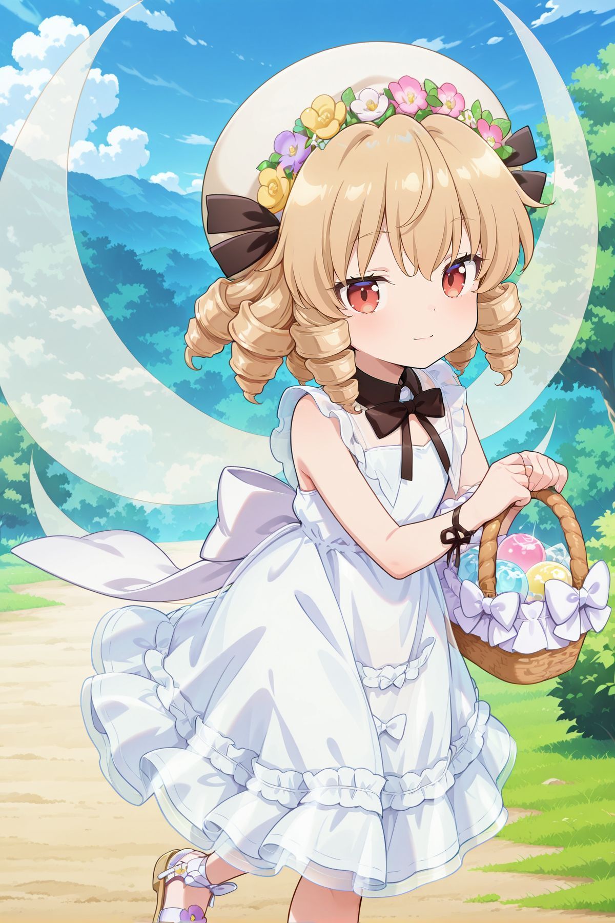 luna child, 1girl, solo, red eyes, blonde hair, medium hair, drill hair, drill sidelocks, fairy, fairy wings, luna child \(white moon fairy\), alternate costume, white headwear, hair flower, hair ribbon, black ribbon, crescent hair ornament, black neck ribbon, wedding dress, white dress, sleeveless dress, arm ribbon, back bow, white bow, sandals, footwear flower, holding basket,