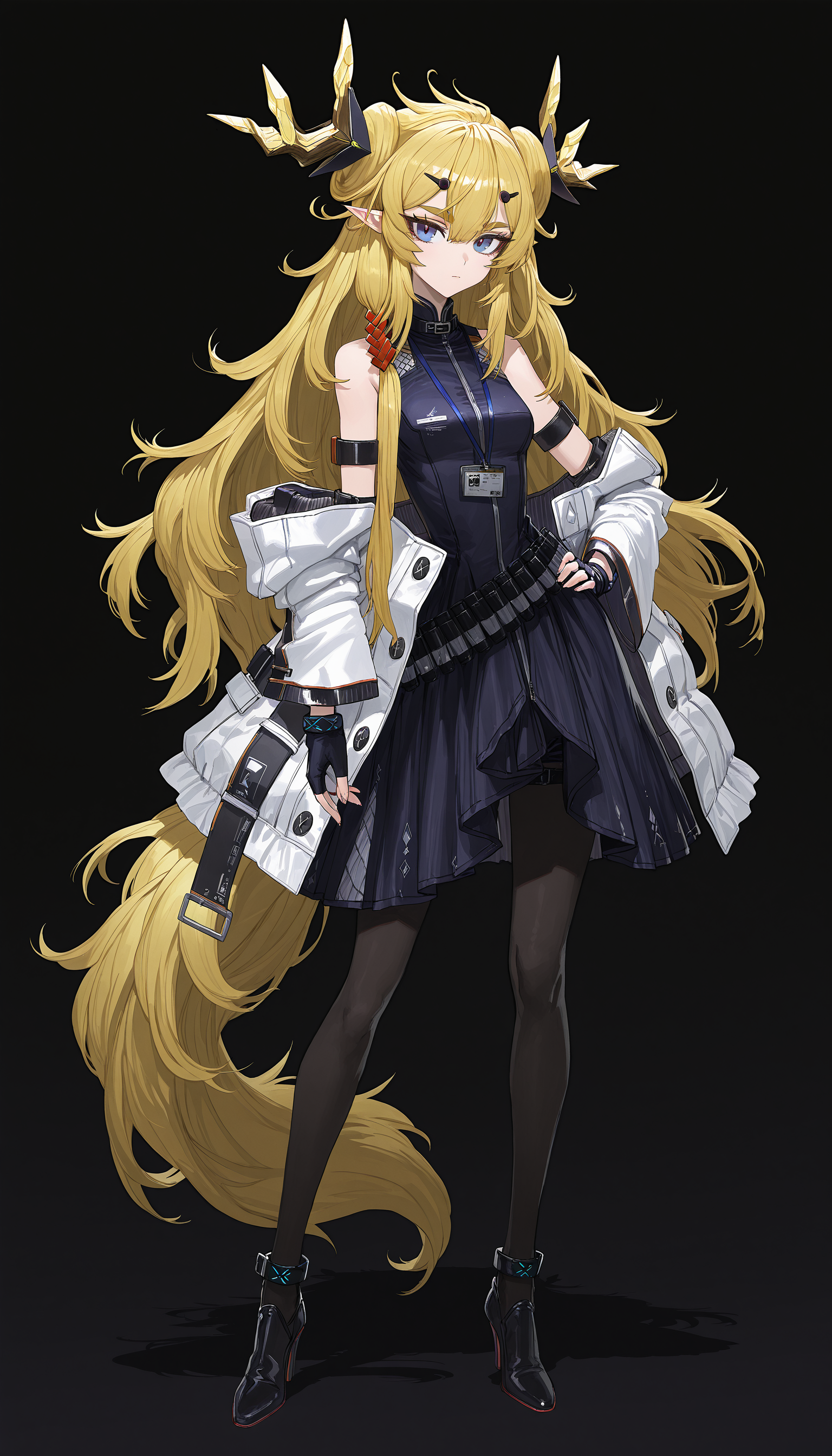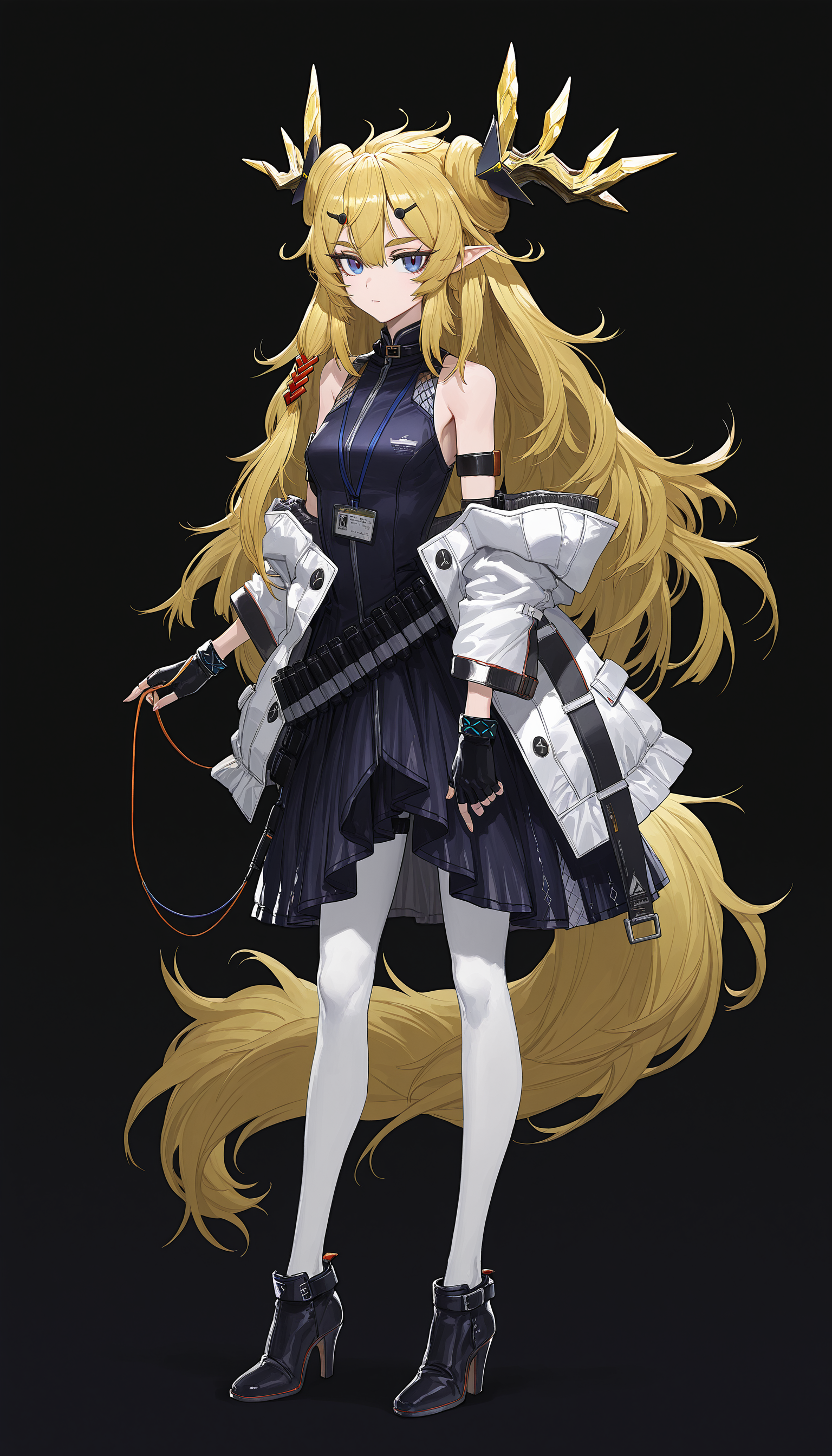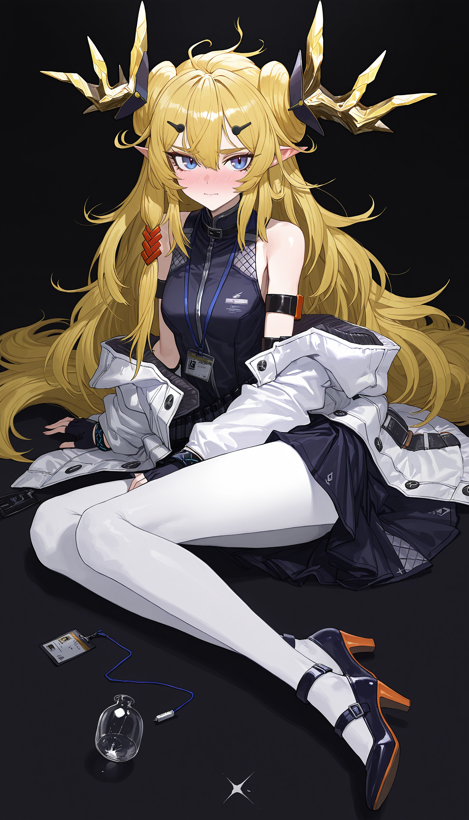 leizi_\(arknights\), blue eyes, blonde hair,horns, pointy ears, hairclip, hair bun , sleeveless dress , off shoulder, fingerless gloves , id card ,black pantyhose , white jacket ,high heels,