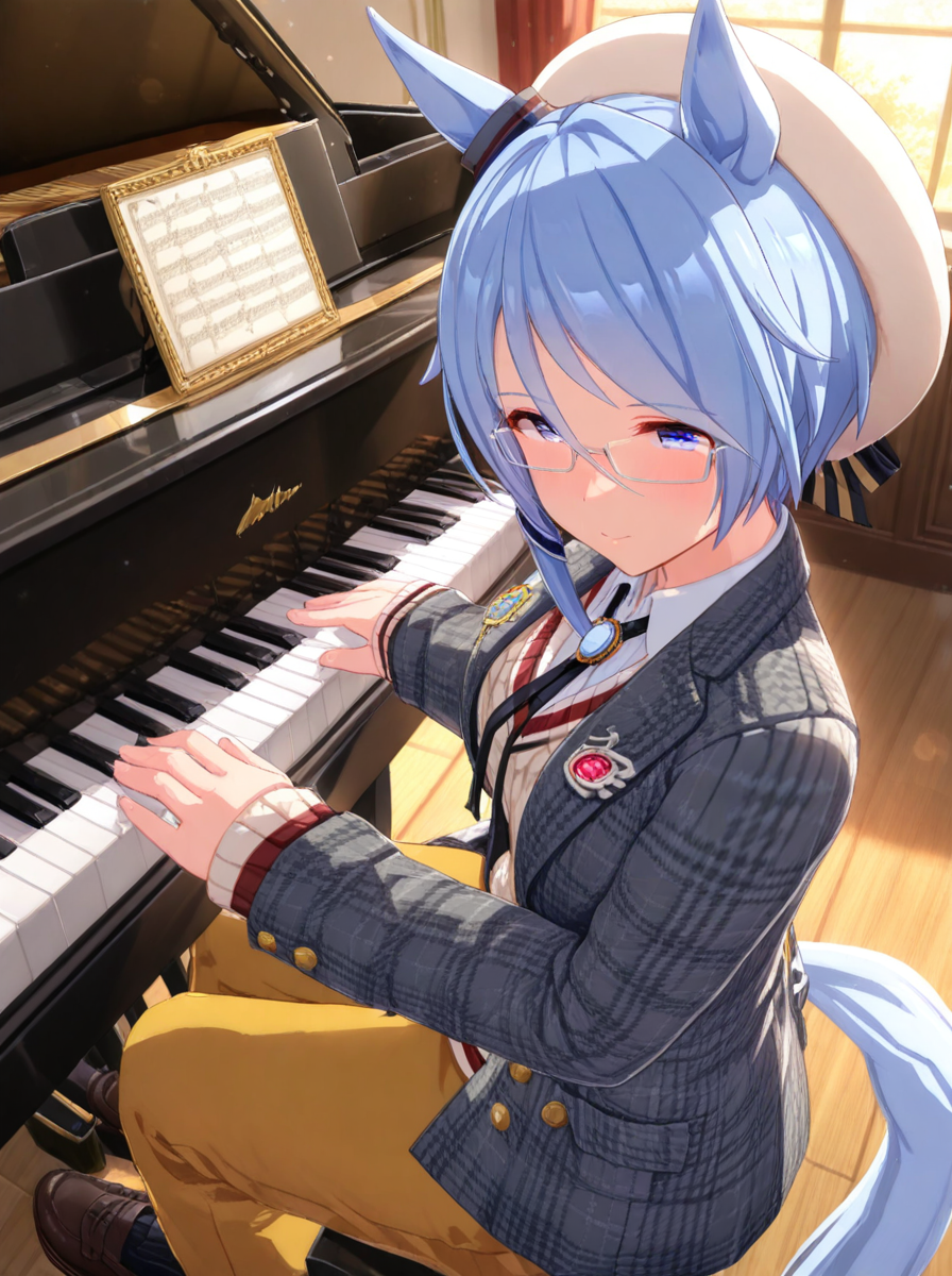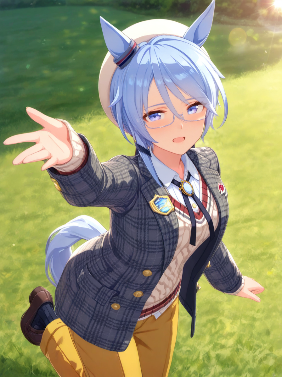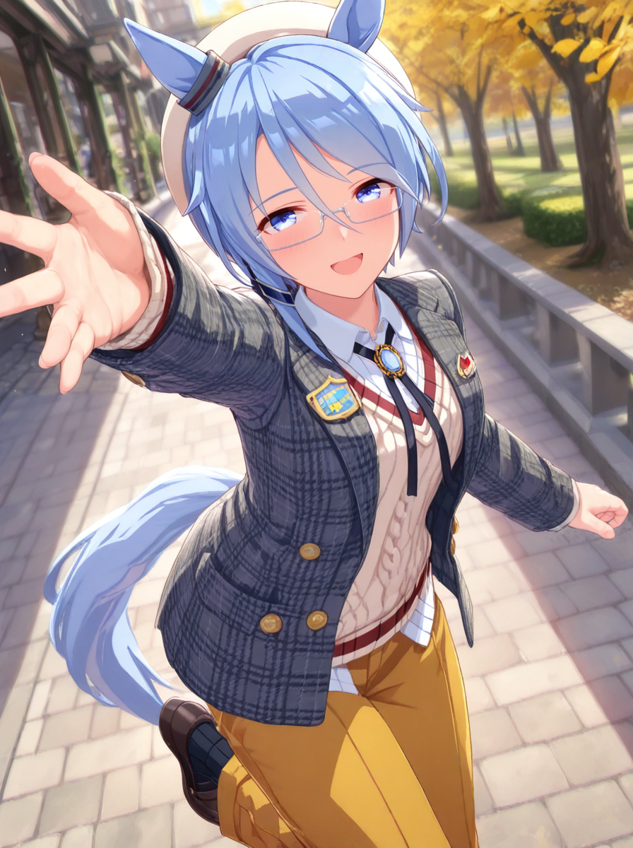 • horse ears,horse tail, yellow pants, cable knit sweater,bespectacled, plaid grey jacket, under-rim eyewear, autumn colors andante, long sleeves, white beret, black socks, open jacket, dark brown shoes, white collared shirt, black neck ribbon, single two-tone striped grey ear ornament, untucked shirt
