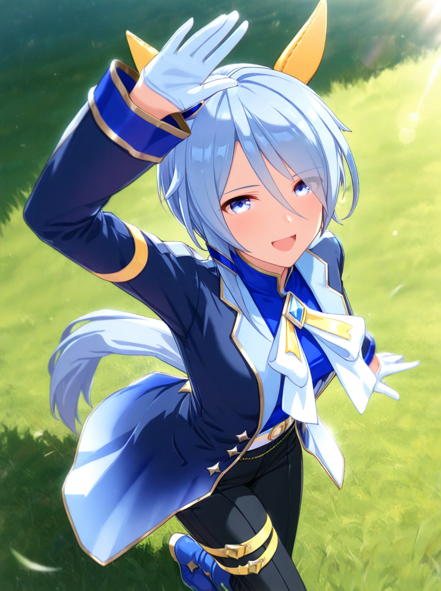 • horse ears, white half gloves, horse tail, asymmetrical blue boots, black pants, ear covers, long sleeves, blue gradient tailcoat, blue collared shirt, white neck ribbon, two-tone belt, yellow leg belt