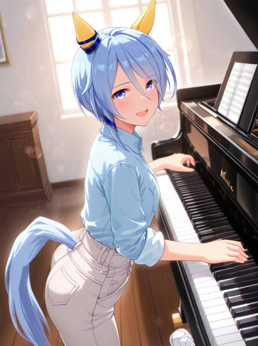 • horse ears, horse tail, white sneakers, blue collared shirt, ear covers, casual, shirt tucked in, sleeves rolled up,light grey high-waist pants, long sleeves, light blue socks