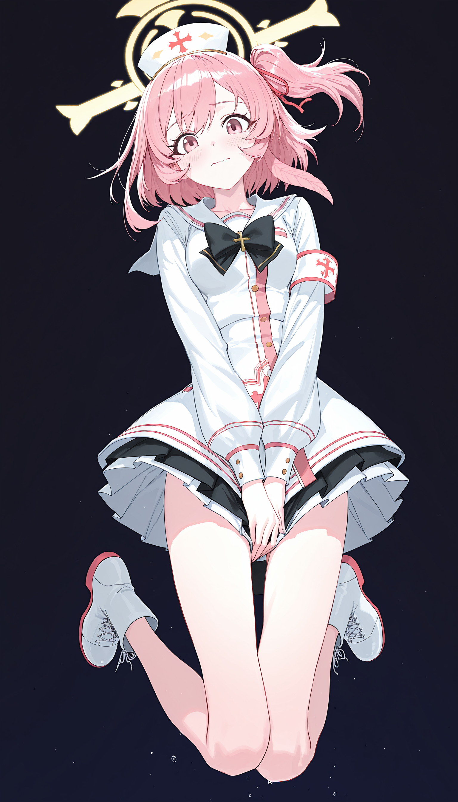 serina_\(blue_archive\) , pink hair , mini nurse cap, pink eyes ,serina halo, one side up , hair ribbon, feather hair , white sailor collar, black bow , black skirt, white dress, armband, boots, first aid kit ,