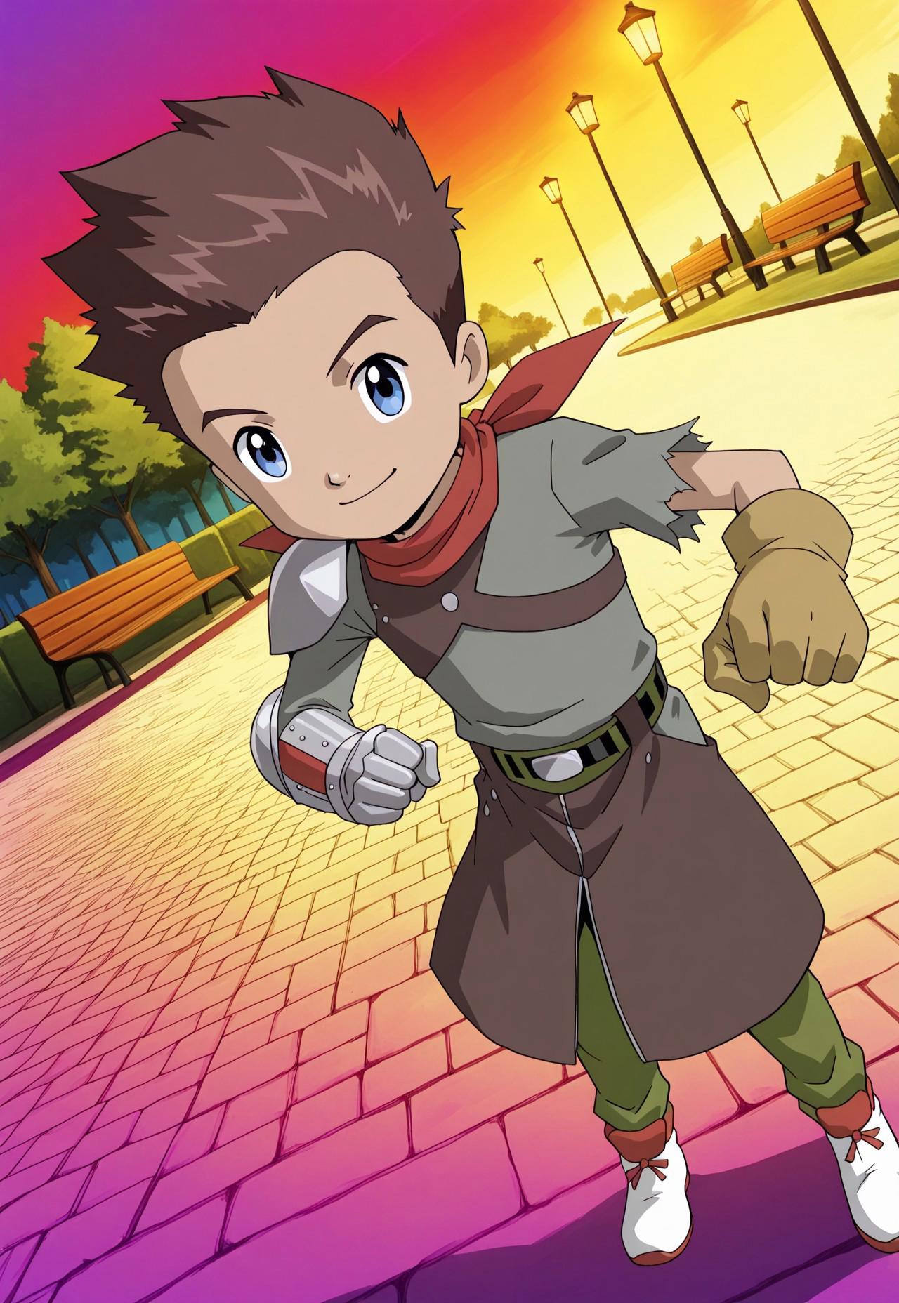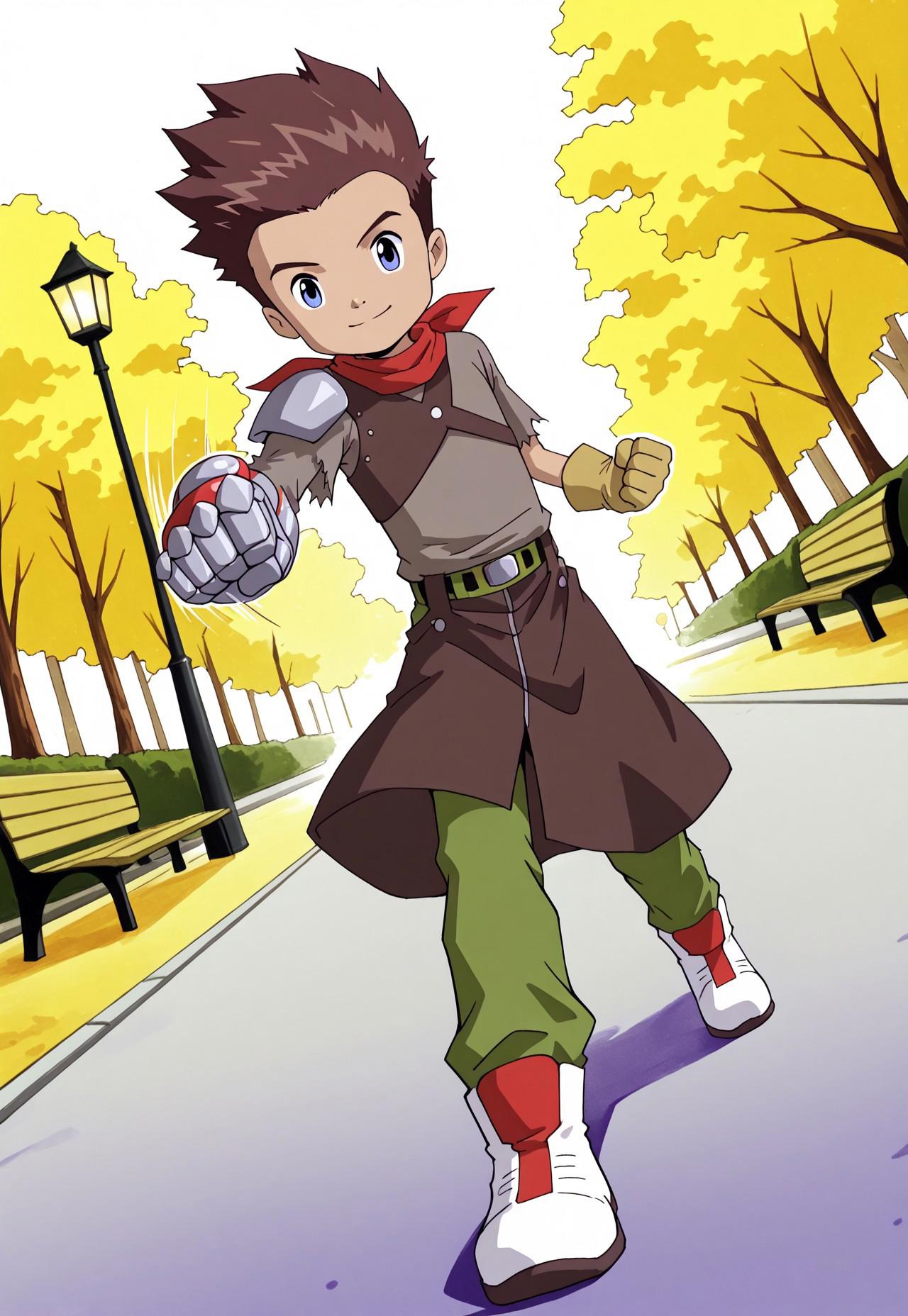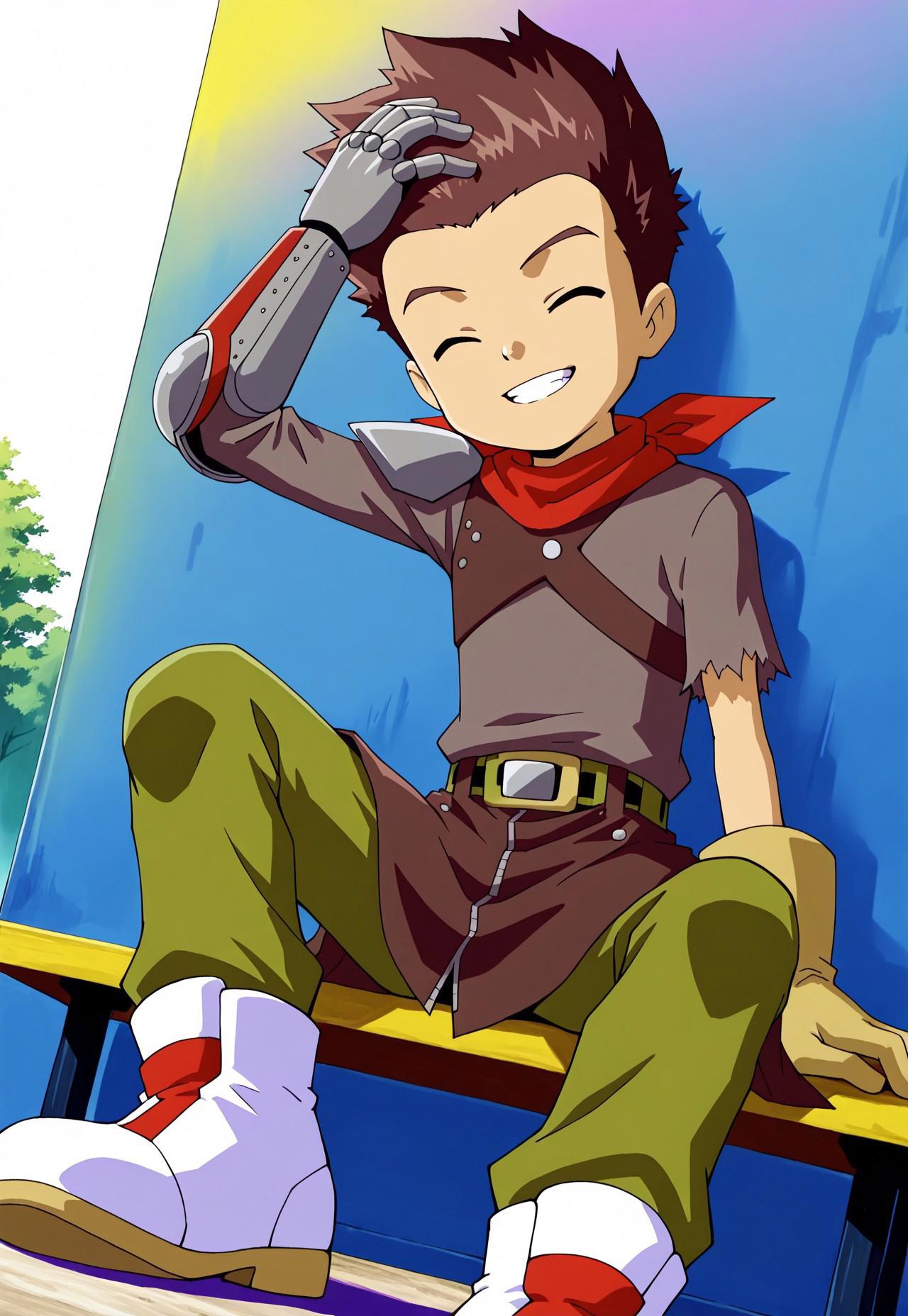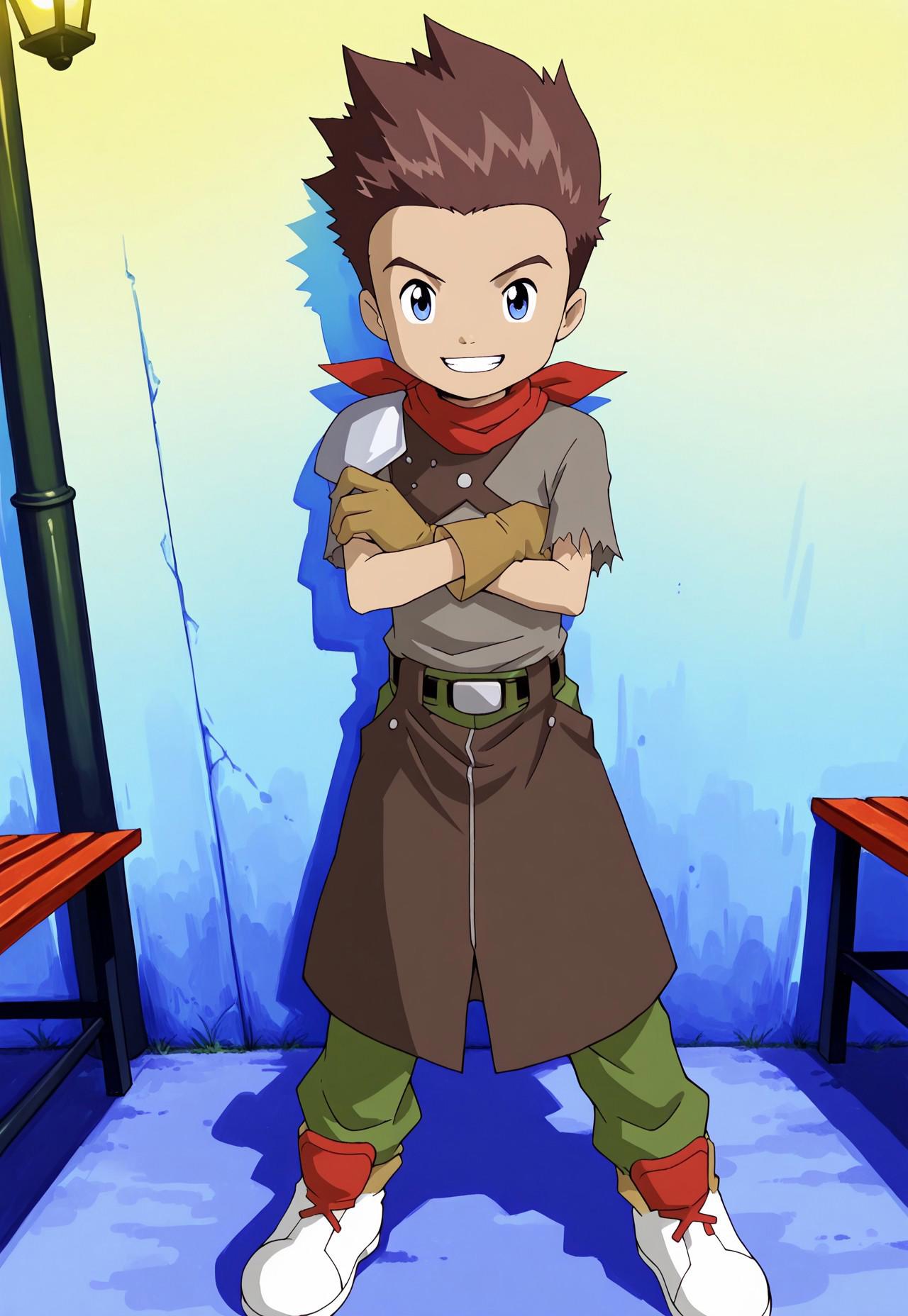 RyoDigi, 1boy, solo, brown spiked hair, blue eyes, red neckerchief, armour, shirt, single mechanical arm, gloves, belt, brown apron, green pants, white footwear