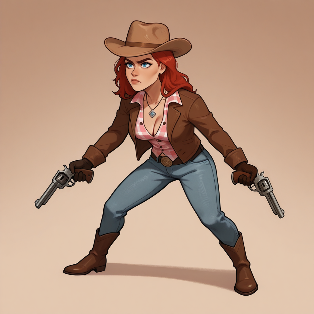 ss-fnvcass-ill, red hair, blue eyes, necklace, pink checkered shirt, cleavage, brown jacket, belt, jeans, gloves,