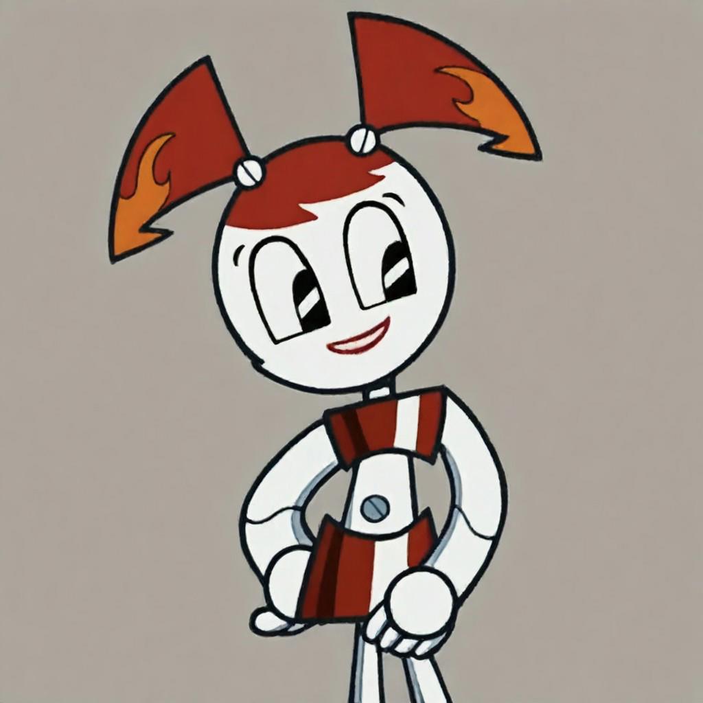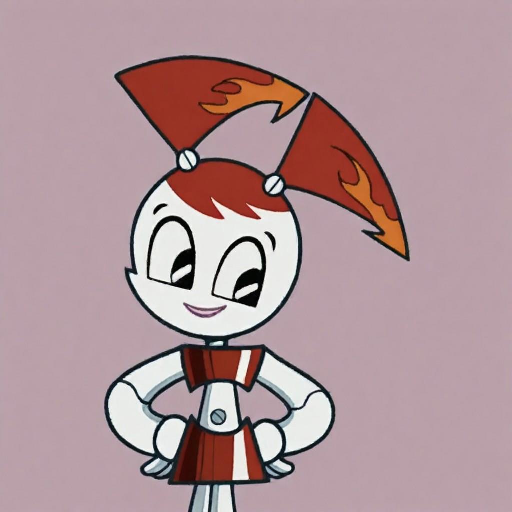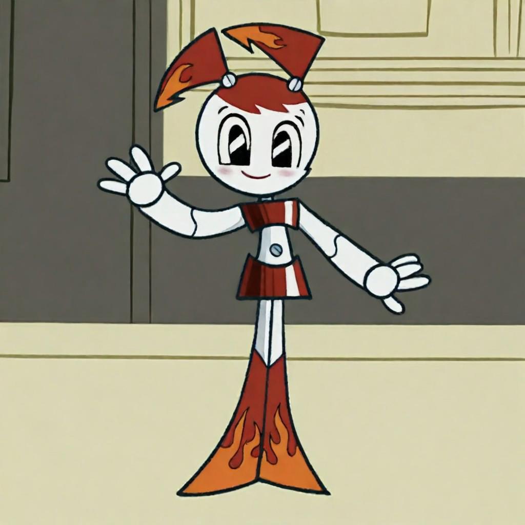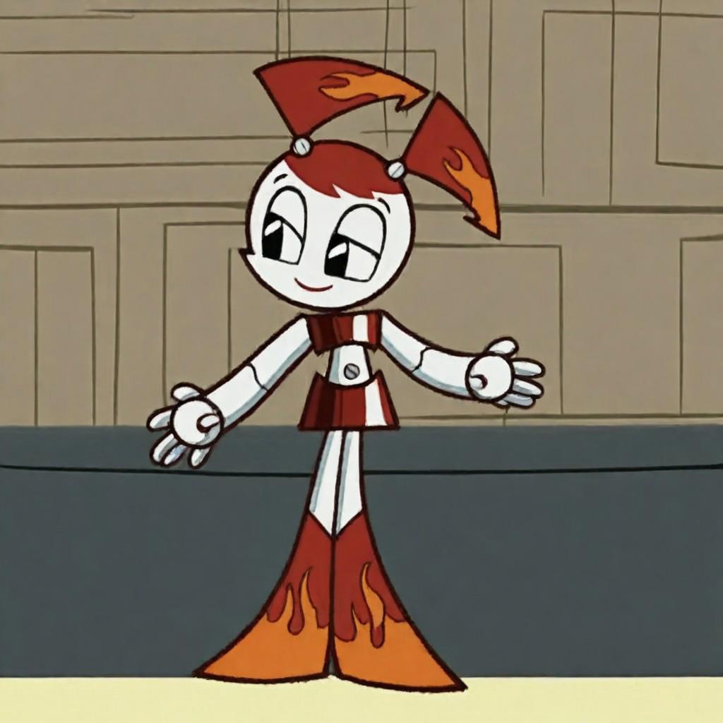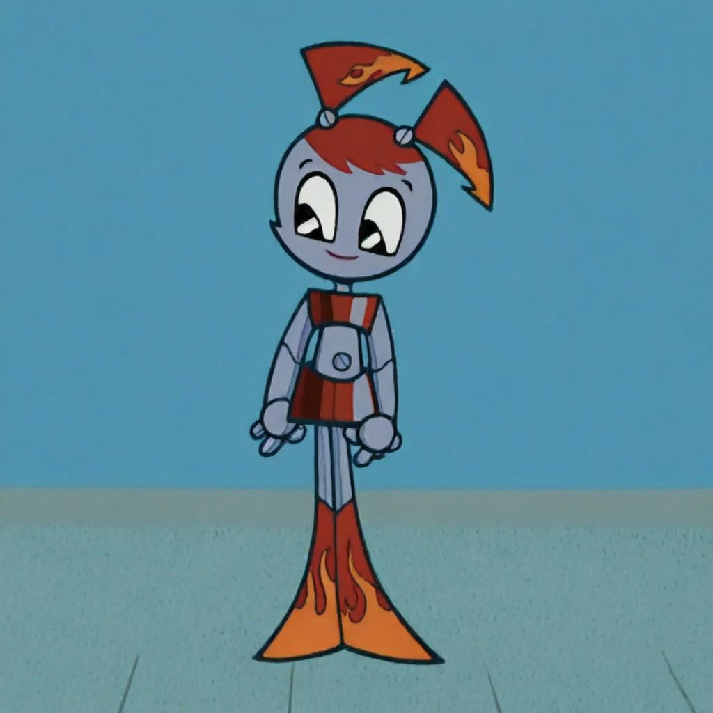 hot rod jenny, jenny wakeman, 1girl, solo, robot joints, twintails, red hair, black eyes, red tube top, red skirt, orange flame accents