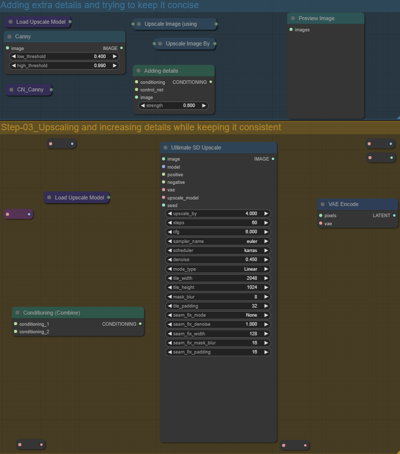 Here is the upscaling part, if you change the "Adding details" node you will increase the details on the upscaled images through a Canny controlnet.