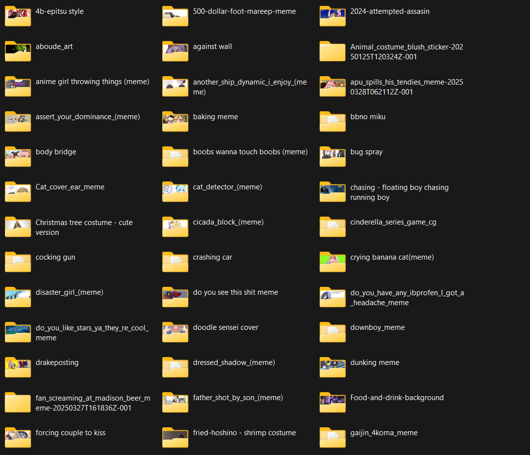Somehow you will get more images for meme when scraping it in Danbooru.