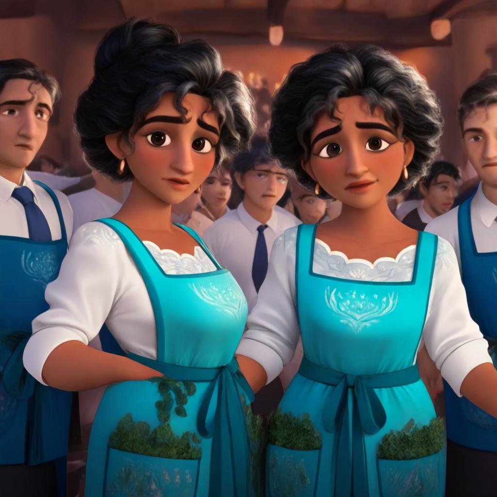 Julieta,1girl,tanned skin,curly black hair tied in a bun,hazel eyes,blue dress with a blue kitchen apron,brown flat shoes, gold earrings