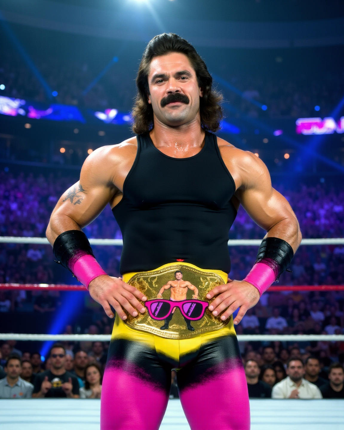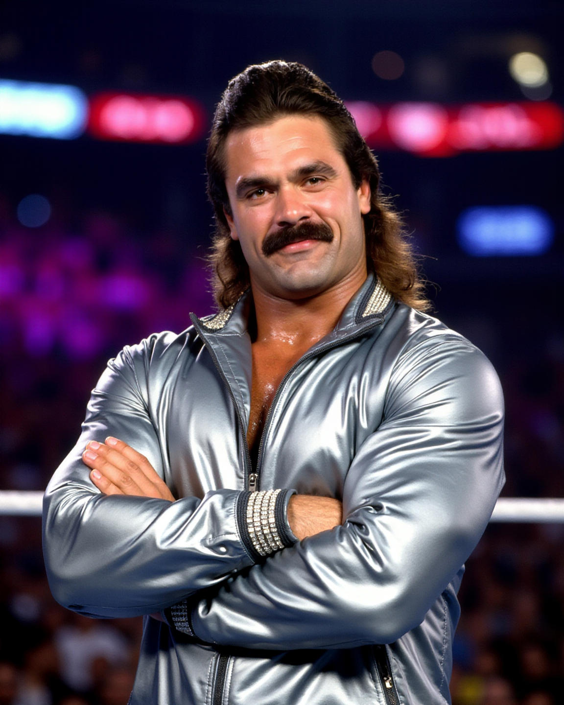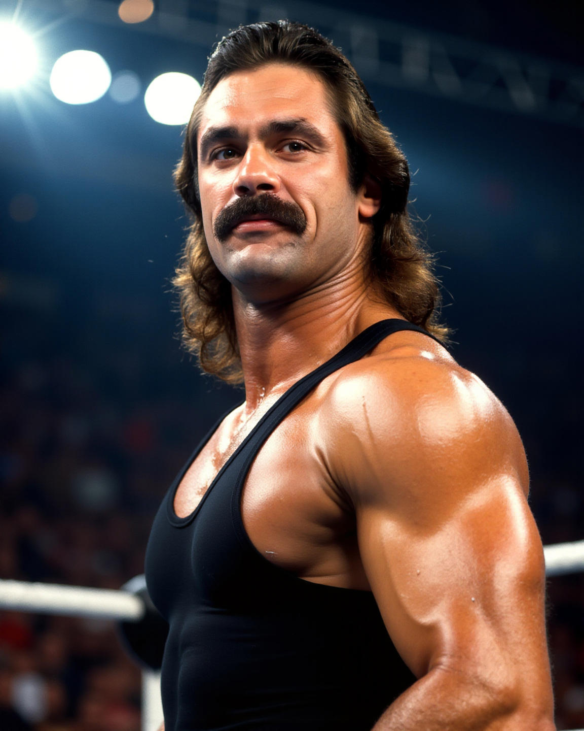 Rick Rude (real name Richard Erwin Rood) was a charismatic American professional wrestler best known for his flamboyant persona, chiseled physique, and arrogant swagger. Rising to fame in the 1980s and early 1990s, he became a staple of both WWF and WCW, often playing the seductive heel who flaunted his looks and insulted male fans while wooing their wives and girlfriends. Known for his signature airbrushed tights, swiveling hips, and smug promos, Rude captured multiple championships and left a lasting legacy as one of wrestling’s most iconic showmen. His blend of vanity, physical prowess, and over-the-top charisma made him unforgettable in and out of the ring.