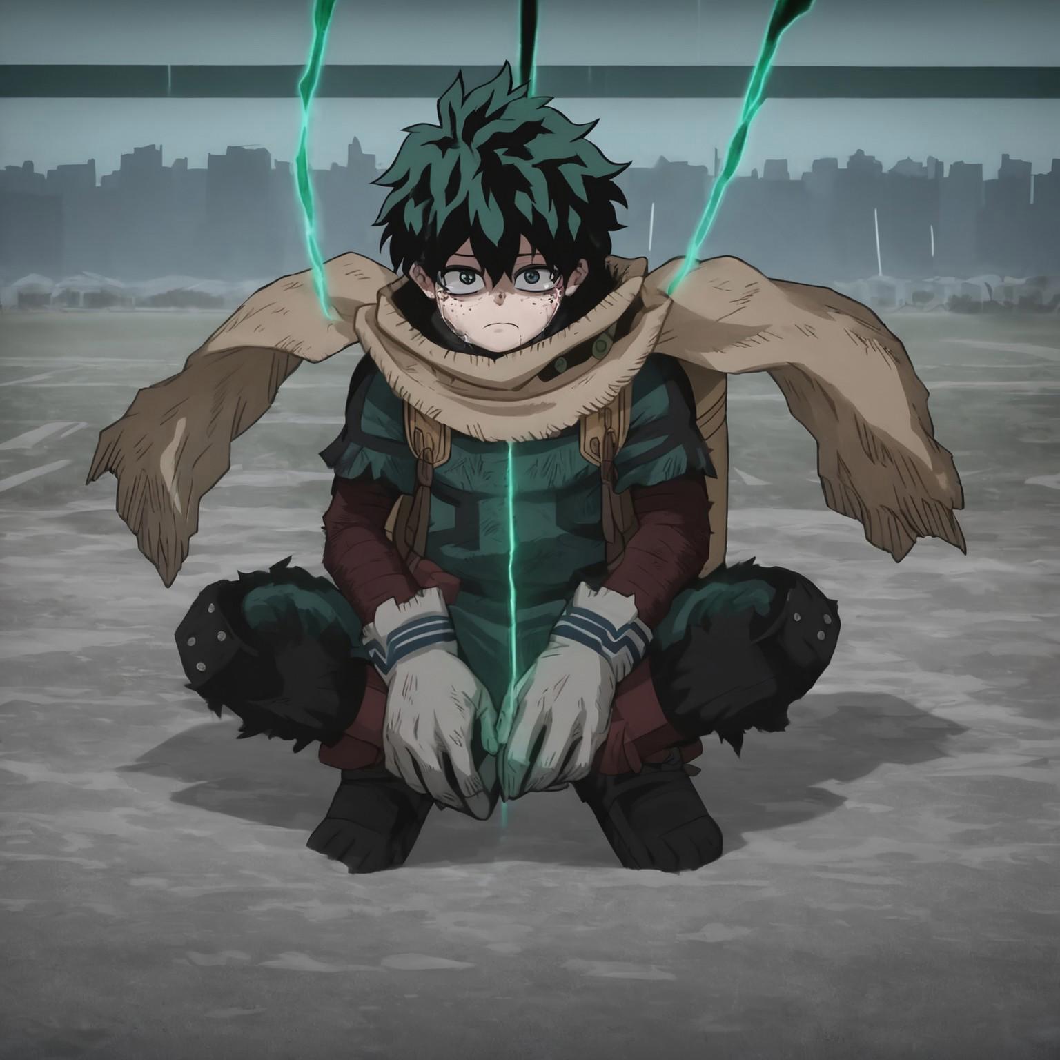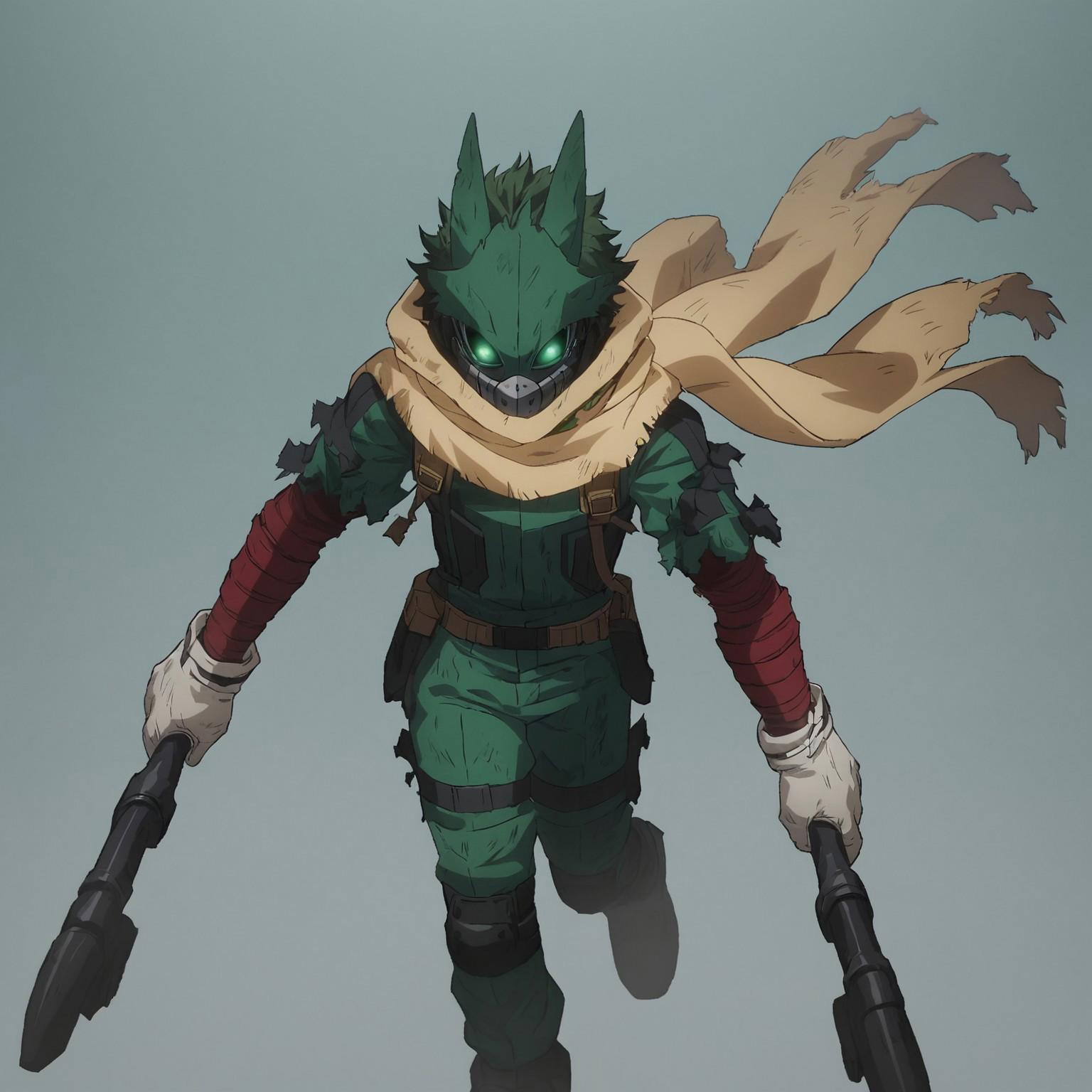 score_9_up, masterpiece, best quality, hyper-detailed, vigalente deku, dark green body suit, torn sleeves, dark red long sleeves, 1boy, green eyes, green hair, scarf, white gloves, sever battle damage, battle damaged mask, green costume with black shadows and black accents, evil looking, hollow eyes, hood with pointed bunny like ears