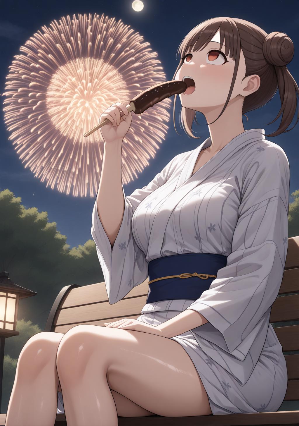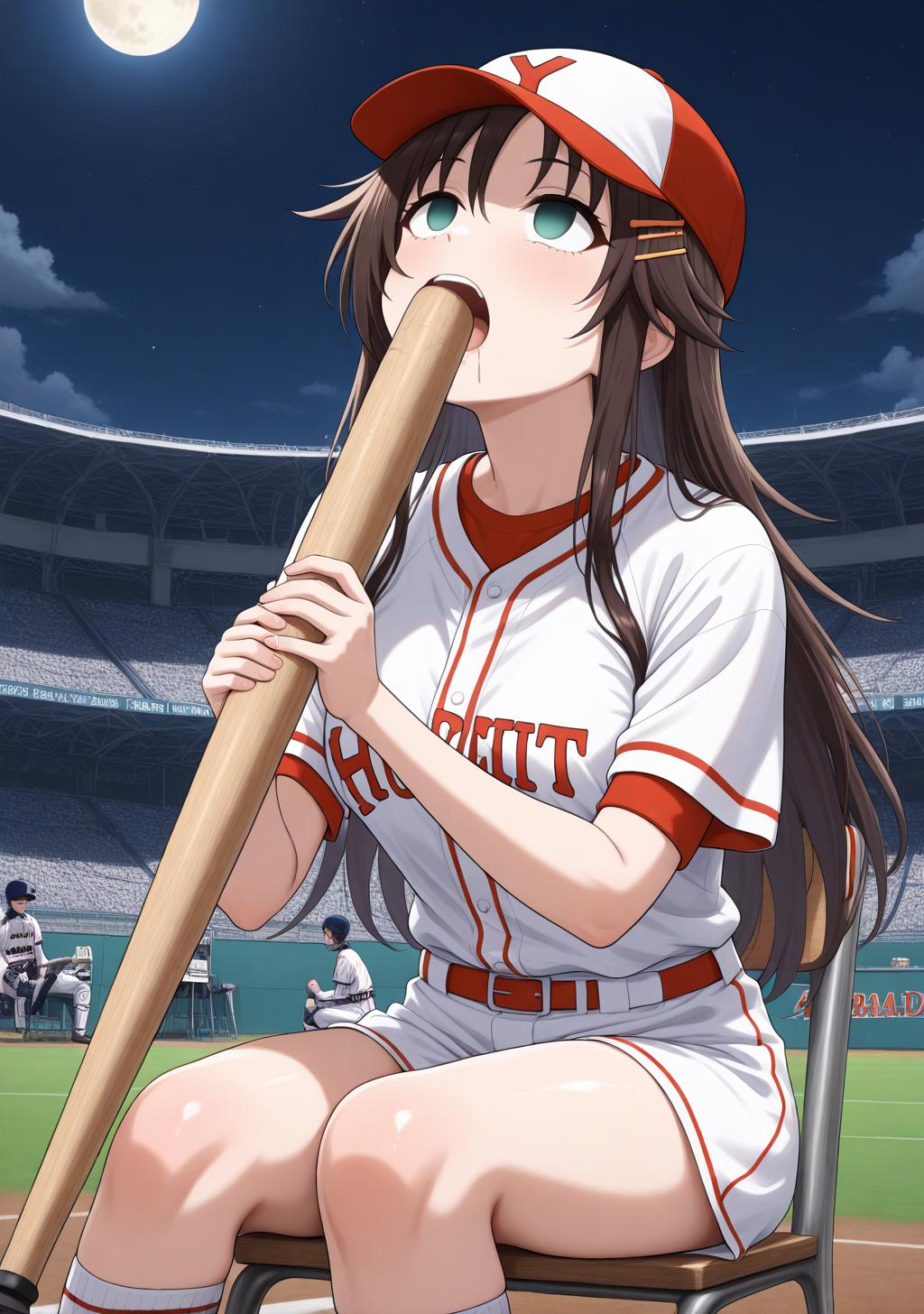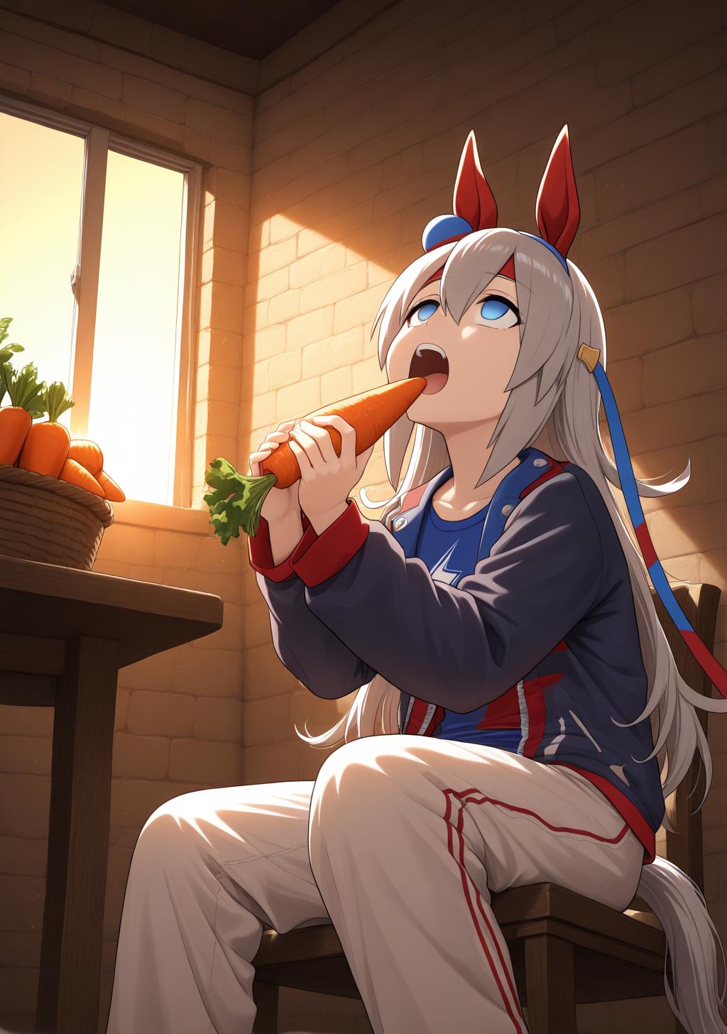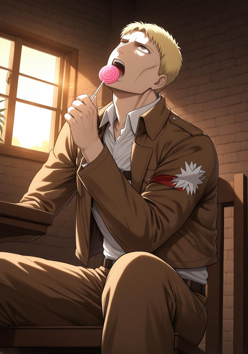 weapon, gun,rifle,holding weapon,holding,sitting,chair,eating,looking up,empty eyes,open mouth