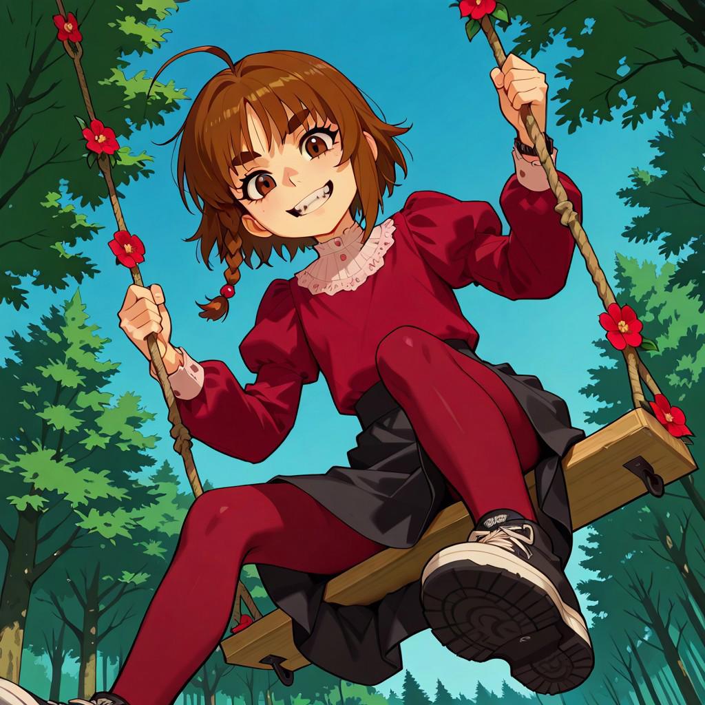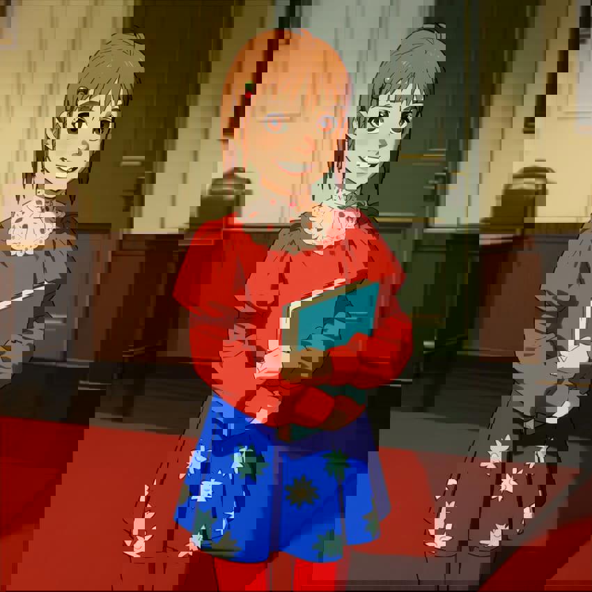 Annemarie, 1girl, alone, thin, short stature, short, brown eyes, dark short straight light brown hair with bangs, thin braid on one side, long-sleeved red blouse with puffy lantern sleeves, red lycra pants, pink false collar with lace and red hearts, pink button in the center of the collar, dark skirt printed with large colorful flowers, black strap shoes
