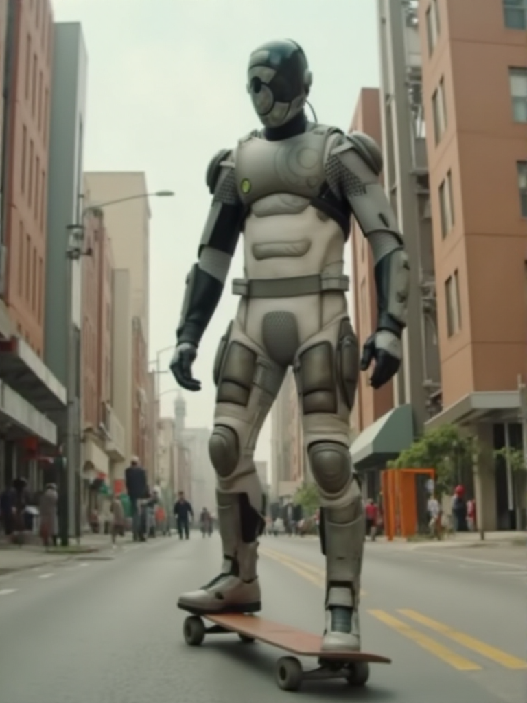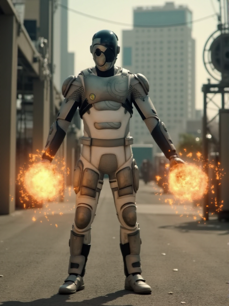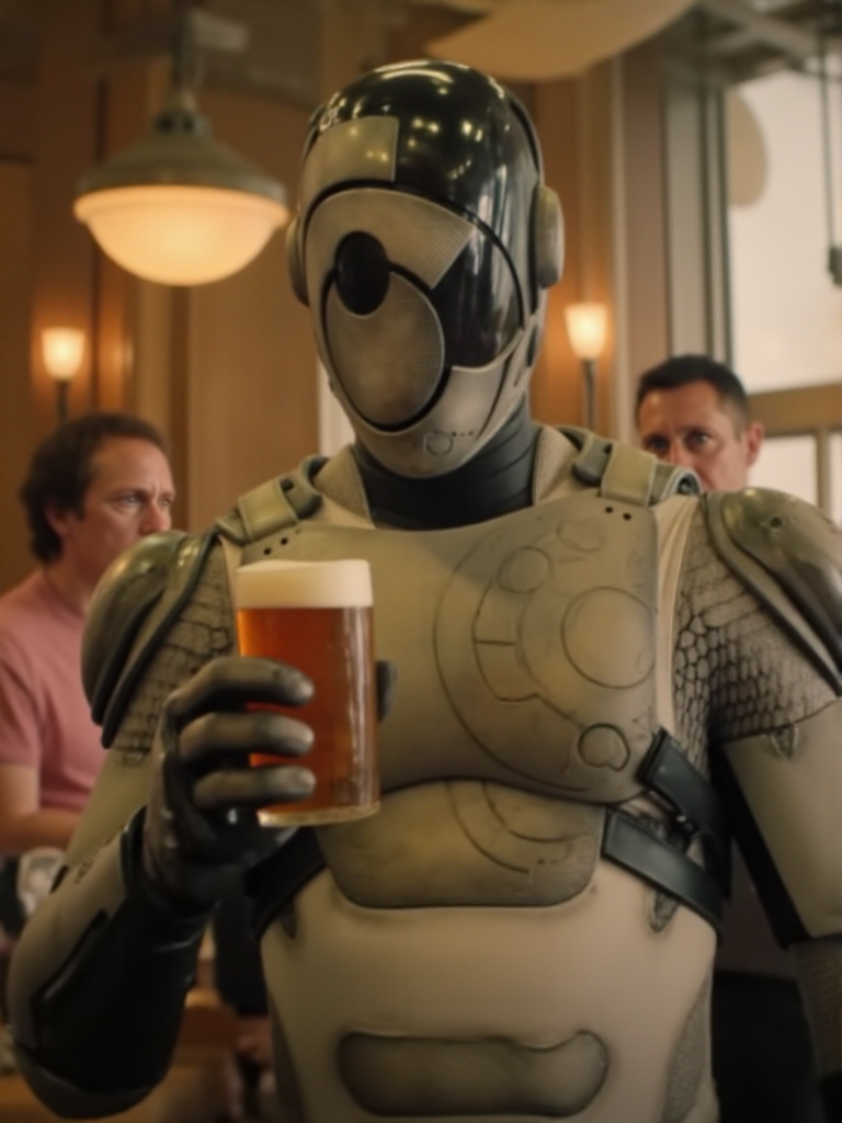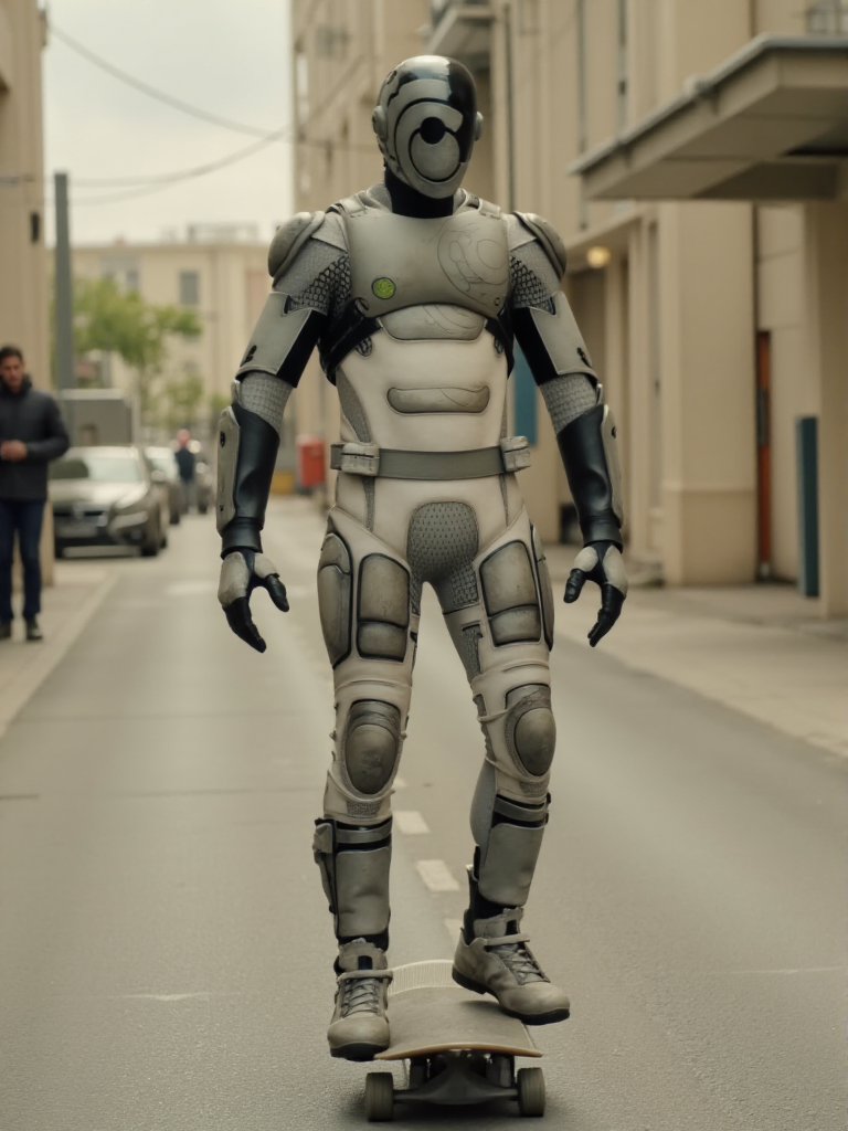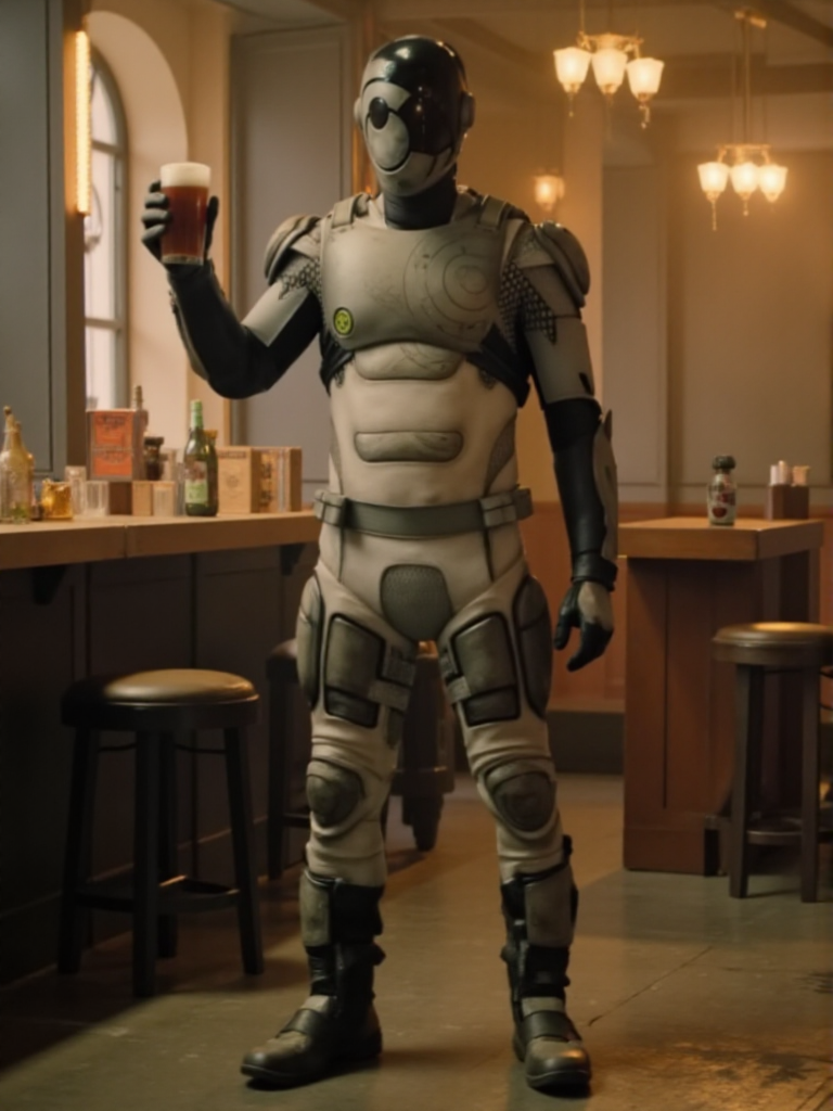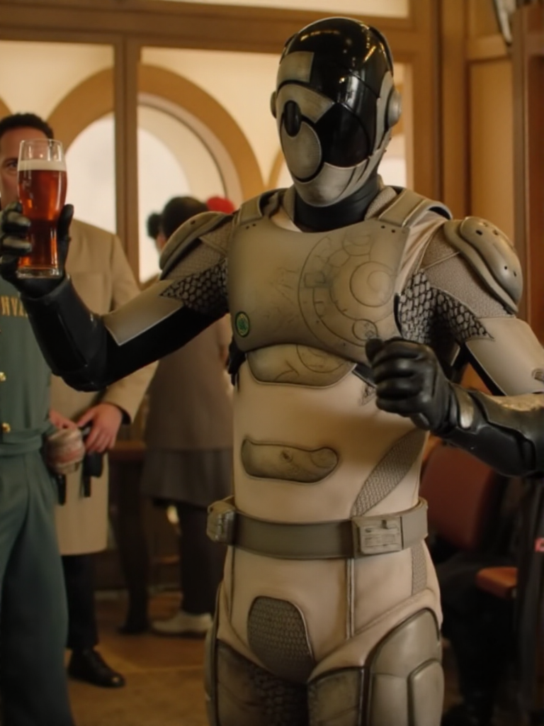 Murderbot, a man wears a science fiction armor