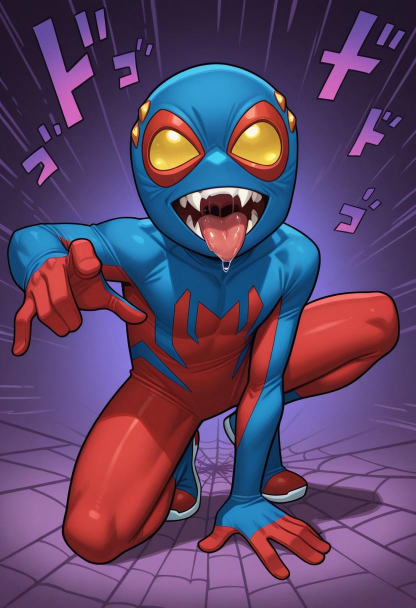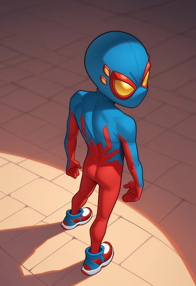 Mask, Yellow Eyes, Spiderboy Costume, Two-tone Bodysuit, Red Bodysuit, Blue Bodysuit, Red Blue Sneakers