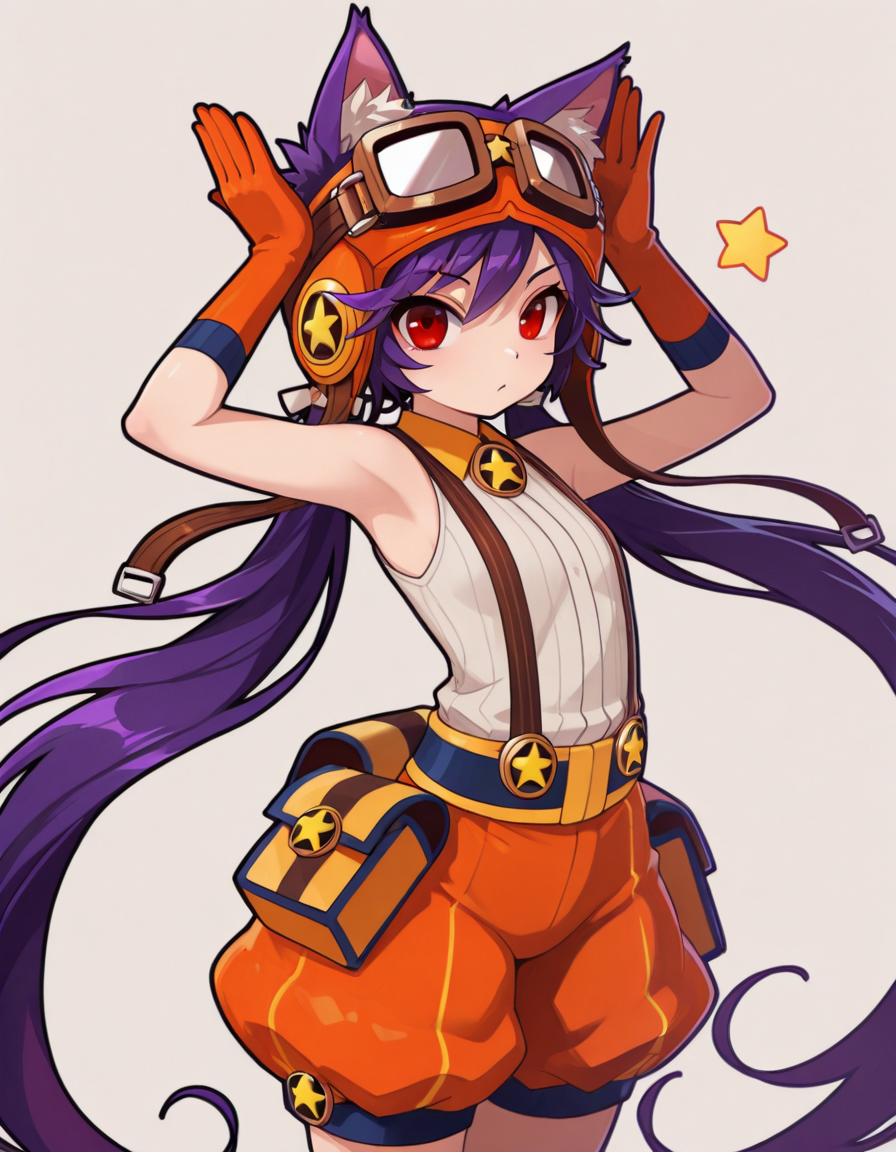 Reinforcement tags: goggles, animal ears, red eyes, goggles on head, very long hair, purple hair, cat ears, twintails, orange gloves, suspenders, sleeveless, puffy shorts, star \(symbol\)