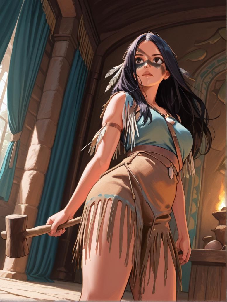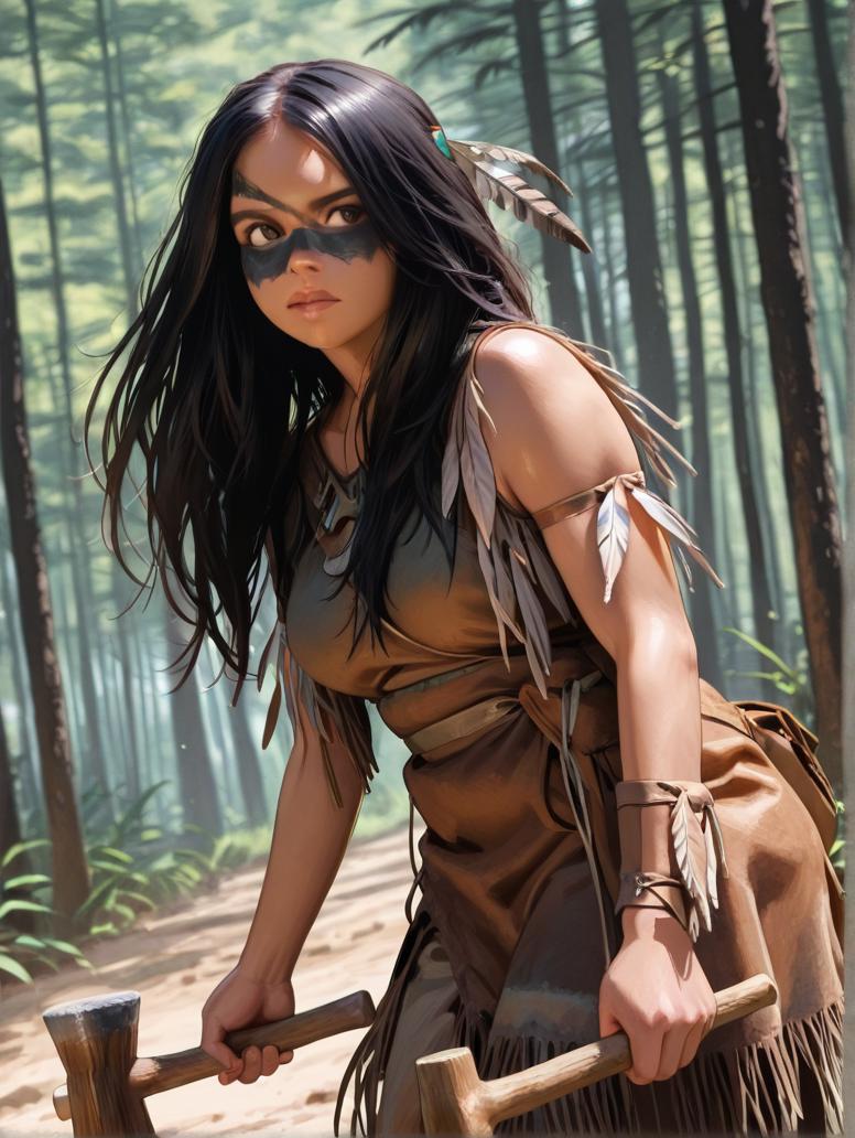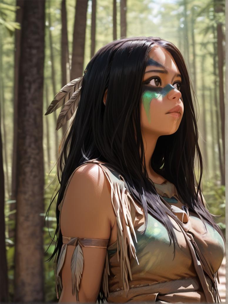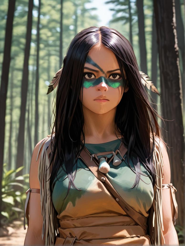 If you wish to place her in her traditional clothes, add these to the prompt: