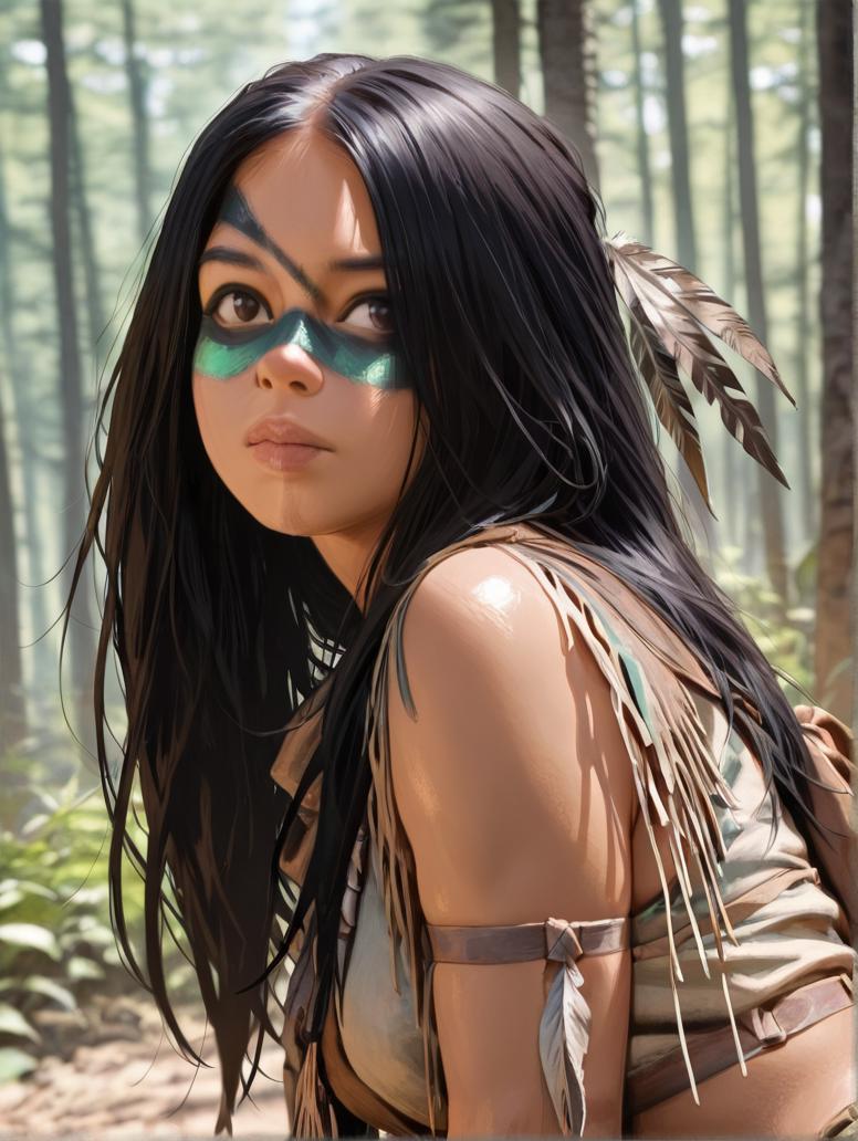 black hair, long hair, green facepaint, black facepaint, multicolor facepaint, feather hair ornament, tribal, realistic,