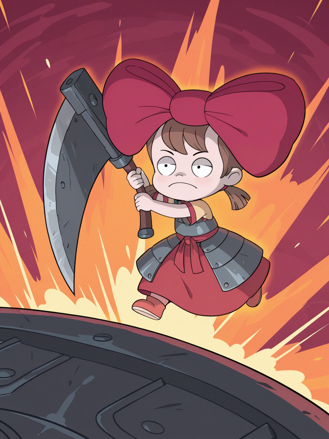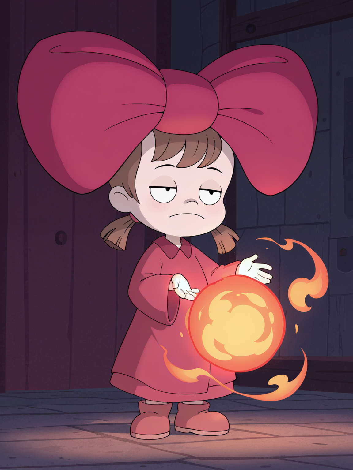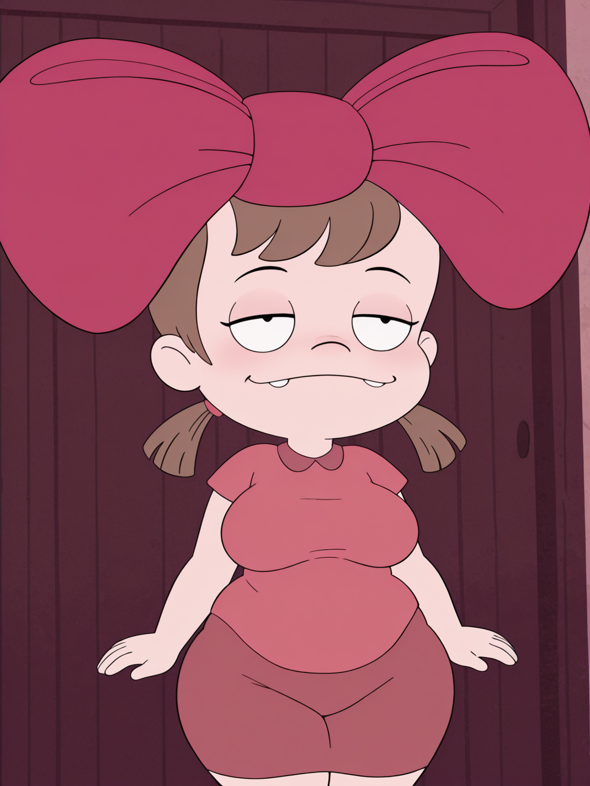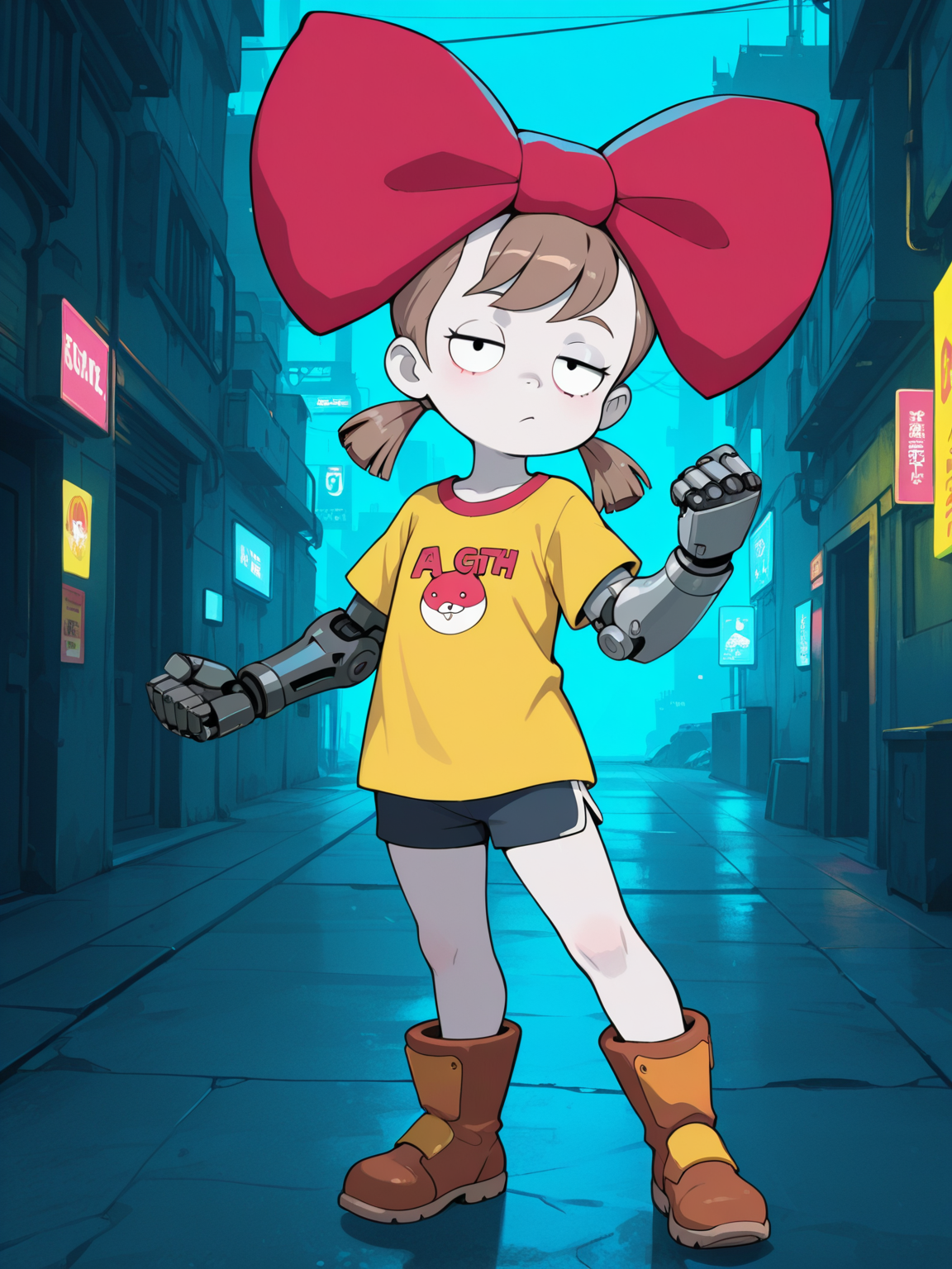 Recommend prompt: "t_b, 1girl, black eyes, pale skin, light brown hair, pigtails hair, fringe, circular eyes, huge bow on head"