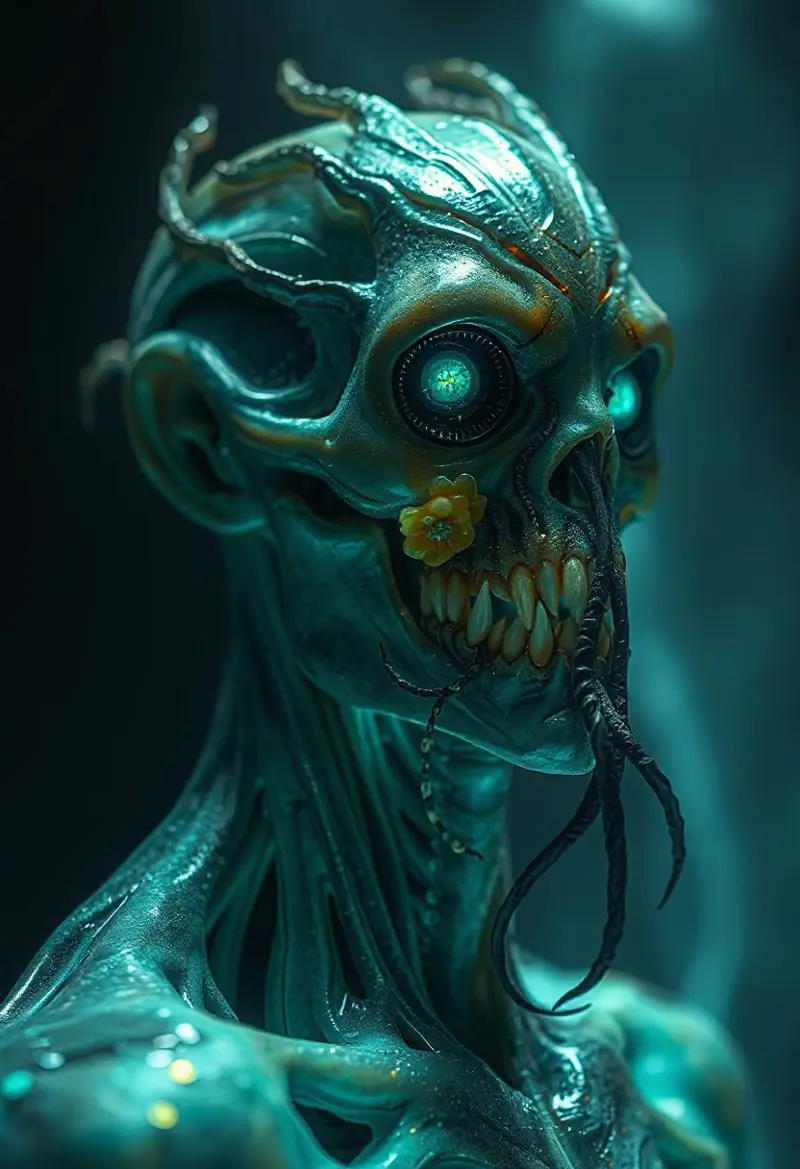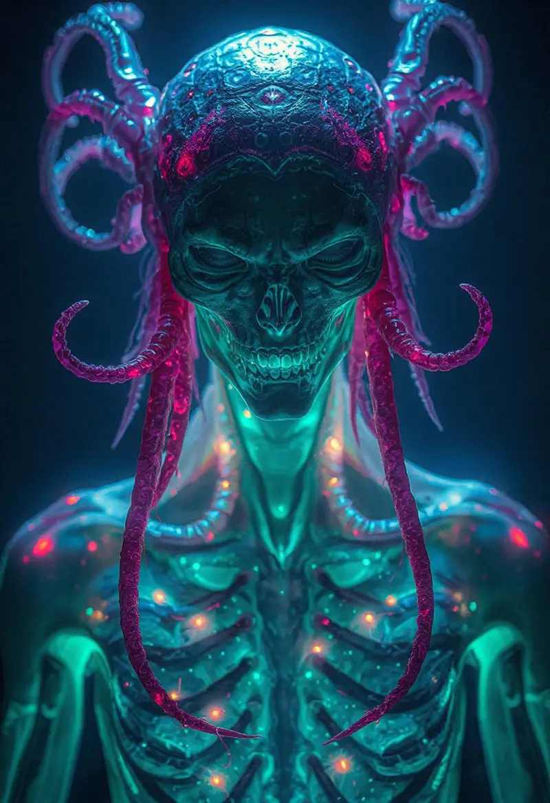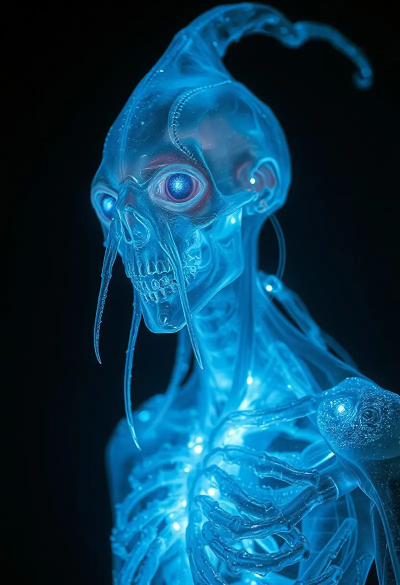 Masterpiece, a bioluminescence translucent clepto-parasitism/humanoid, 32k, 16k, 8k, cinematic art, realistic art, detail,