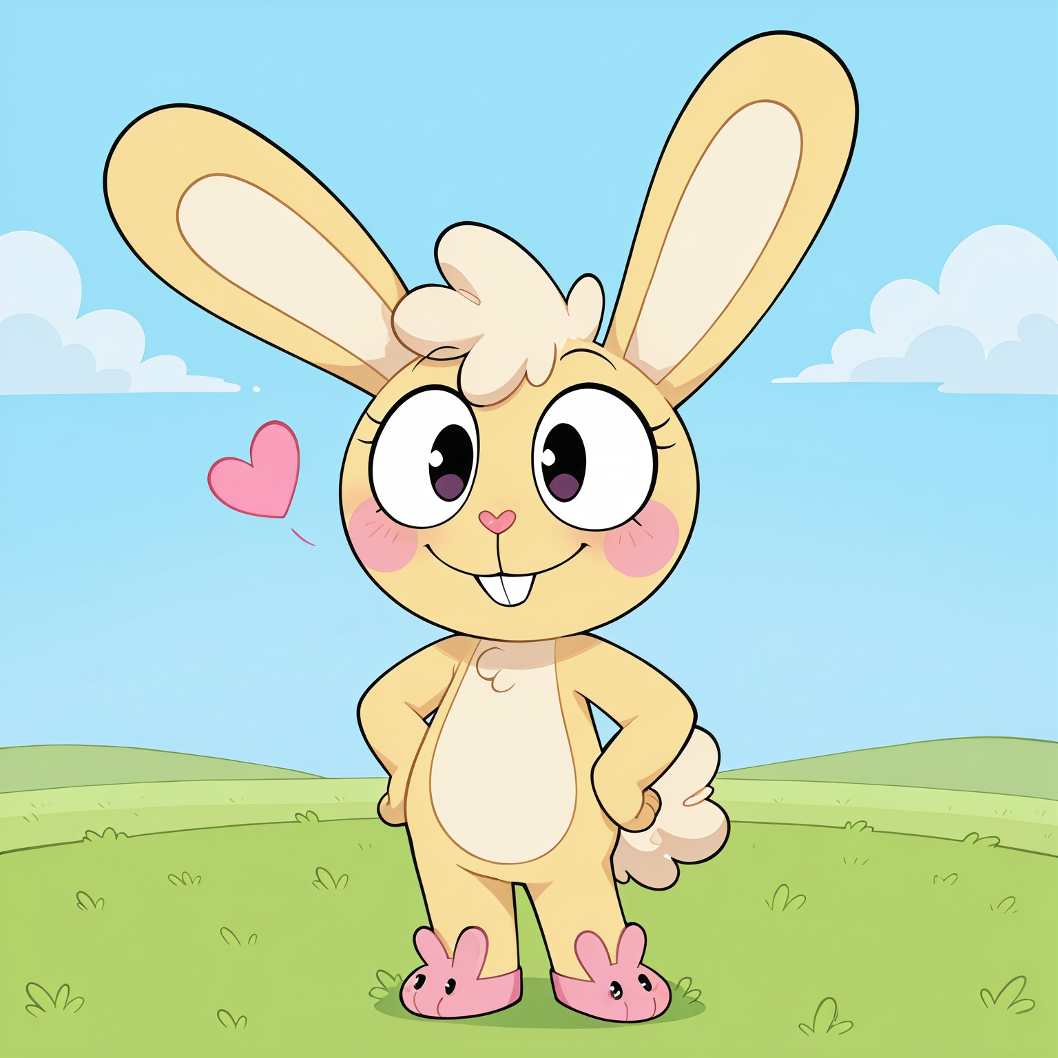 anthro, cartoony, round bunny face, yellow fur, large cartoon eyes, pink blush cheeks, buck teeth, pink heart nose, tuft of fur on head, light beige inner ears, long floppy ears, round fluffy tail, pale yellow belly,