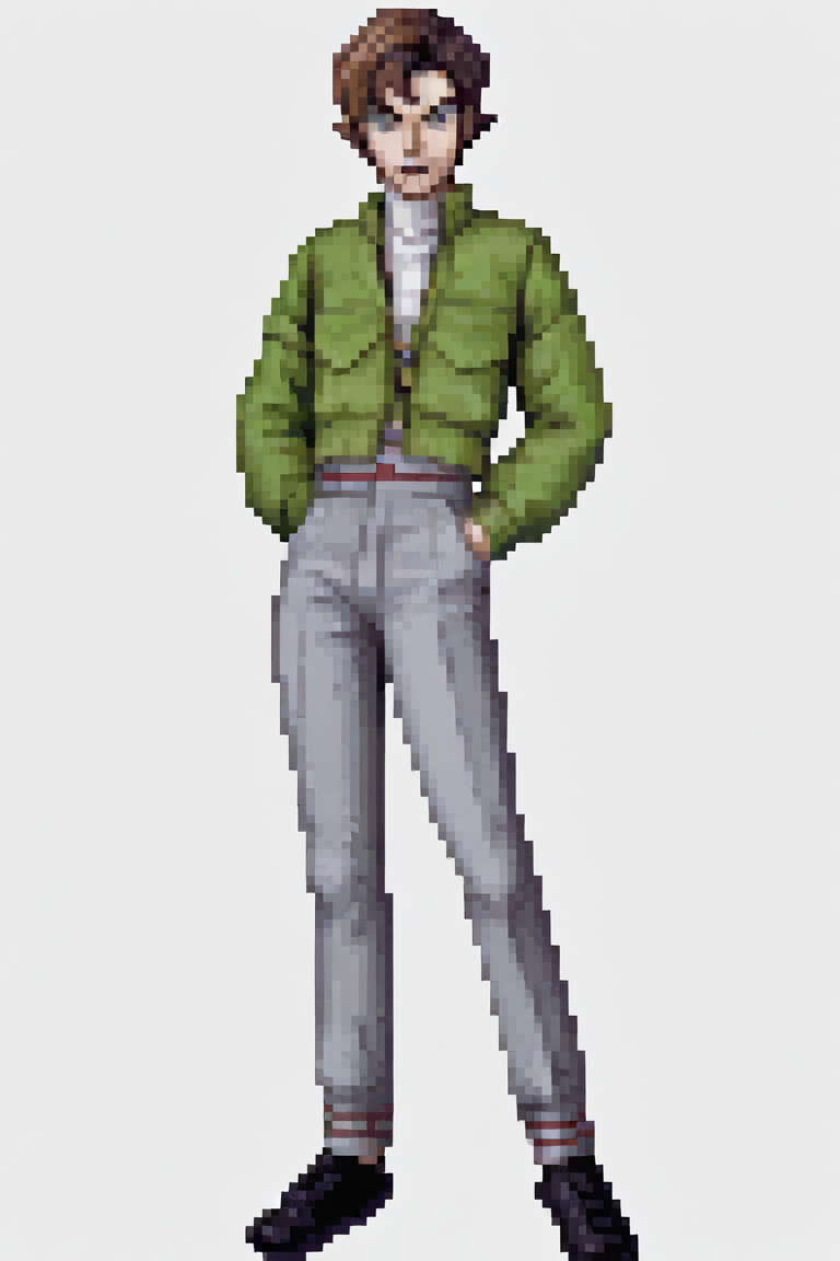 1boy, male focus, brown hair, short hair, grey eyes, white turtleneck shirt, green zipped jacket, stripe trimmed pants, grey pants, black shoes, aged up, dark upper lip
