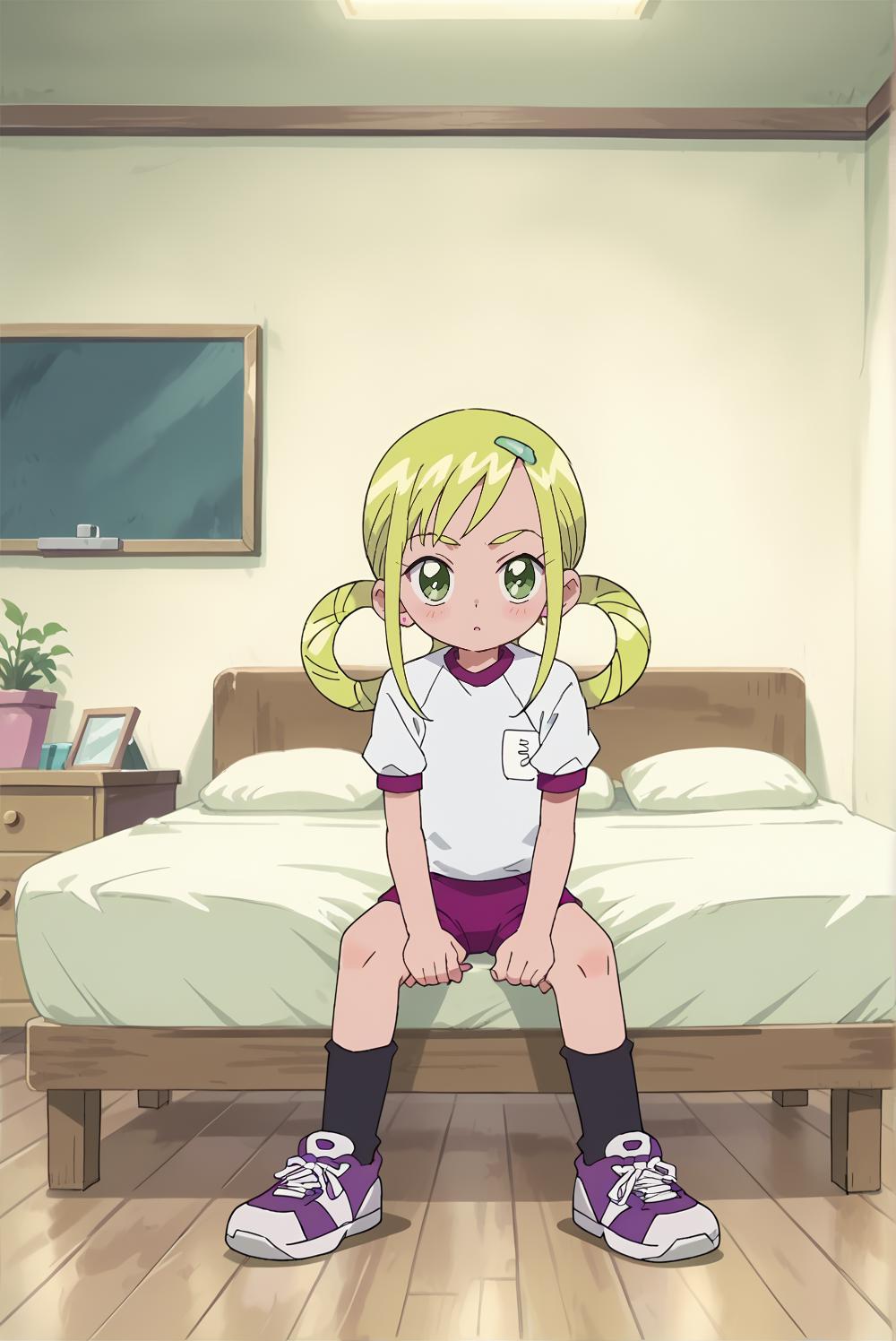 Gym: momoko-asu, gym, 1girl, green eyes, blonde hair, hair rings, hairclip, white shirt, white shirt with magenta accents, short sleeves, magenta buruma, nametag, purple sneakers, black socks
