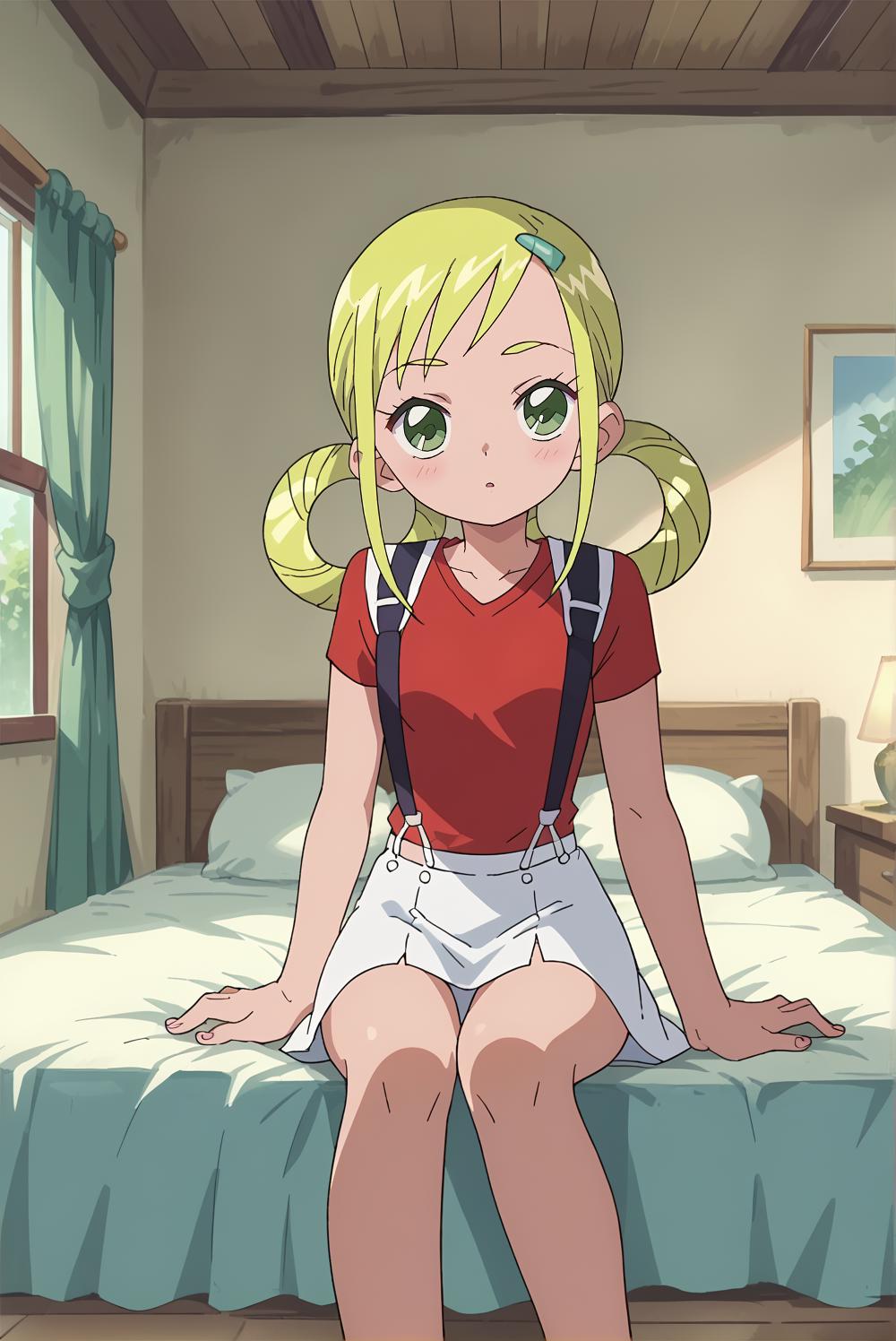 momoko-asu, casual, 1girl, green eyes, blonde hair, hair rings, hairclip, red shirt, straps, white skirt