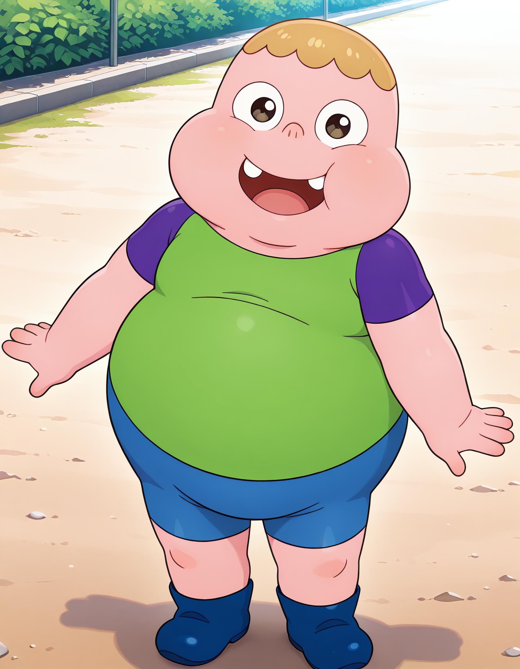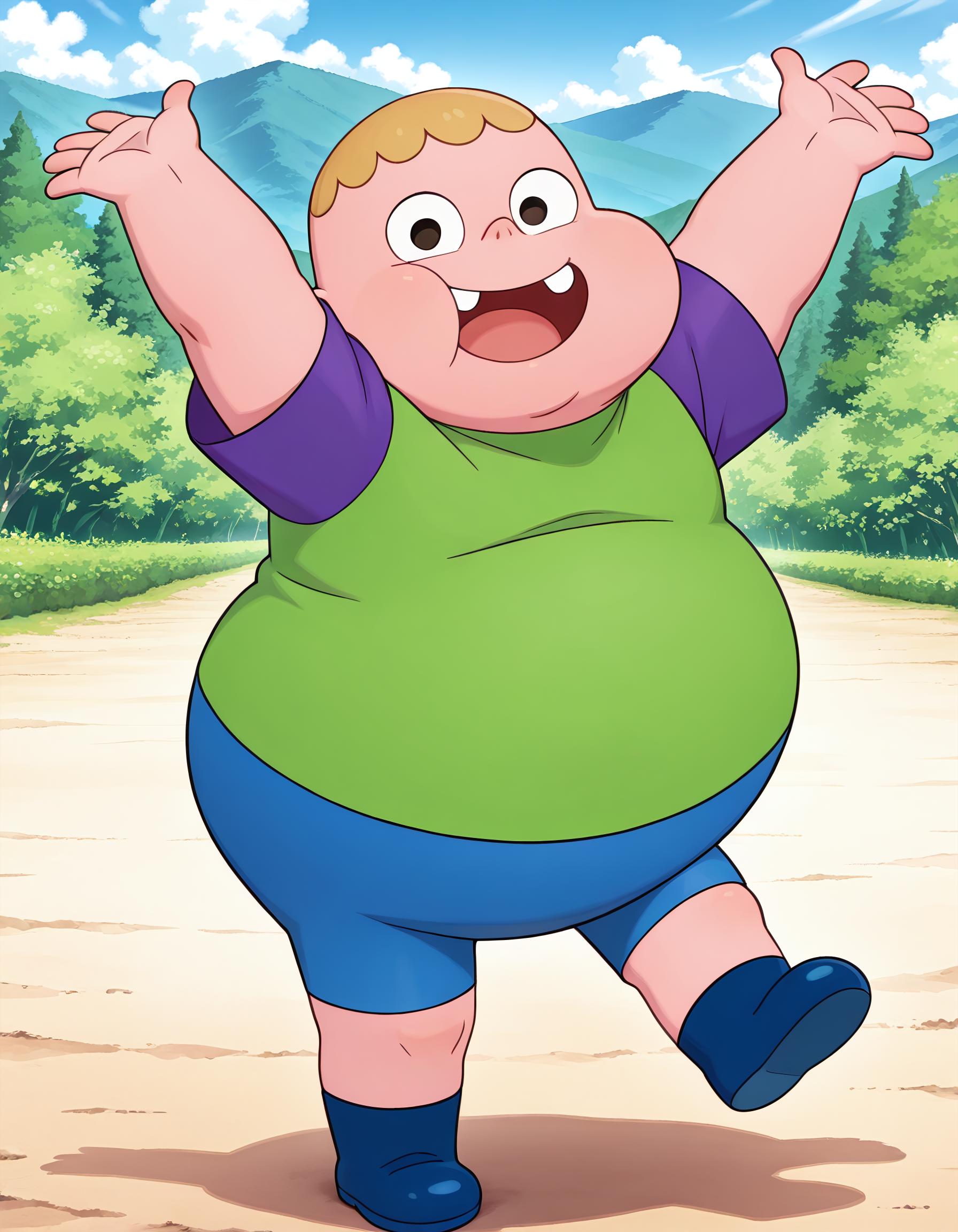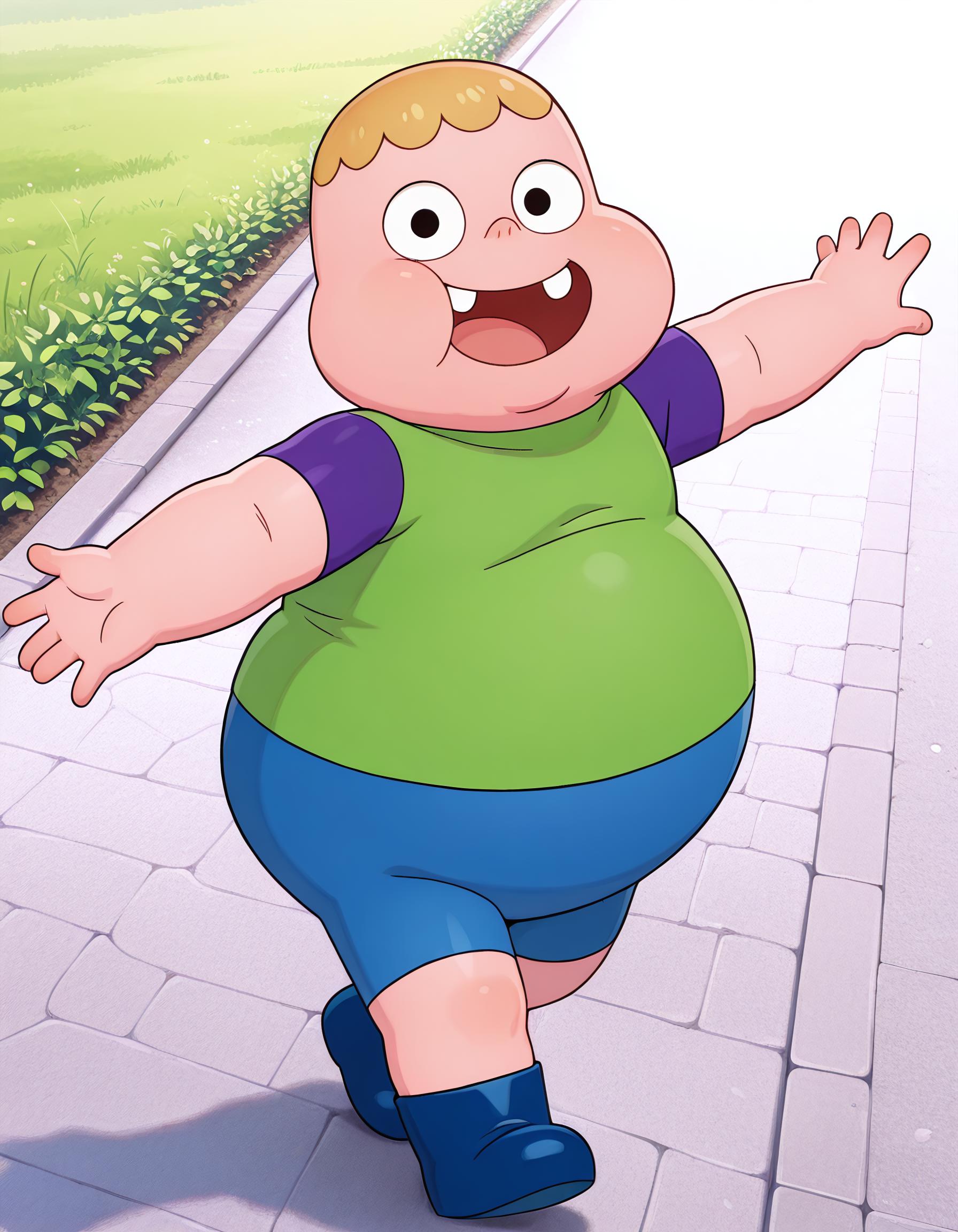 Clarence, 1boy, male focus, plump, fat, chubby, obese, earless, no ears, two teeth, nostrils, young, short, blonde hair