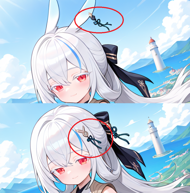 If you remove the rabbit ears and increase the strength of "(hair ornament:1.2)", the position of the hair ornament will change when the character is human.