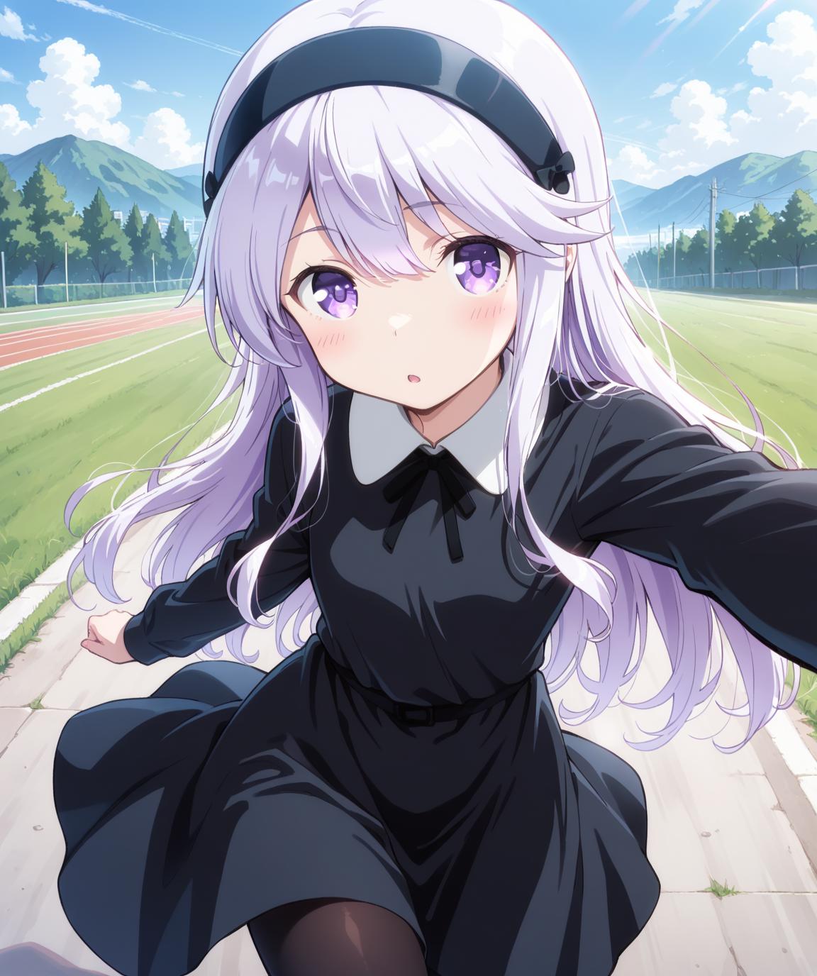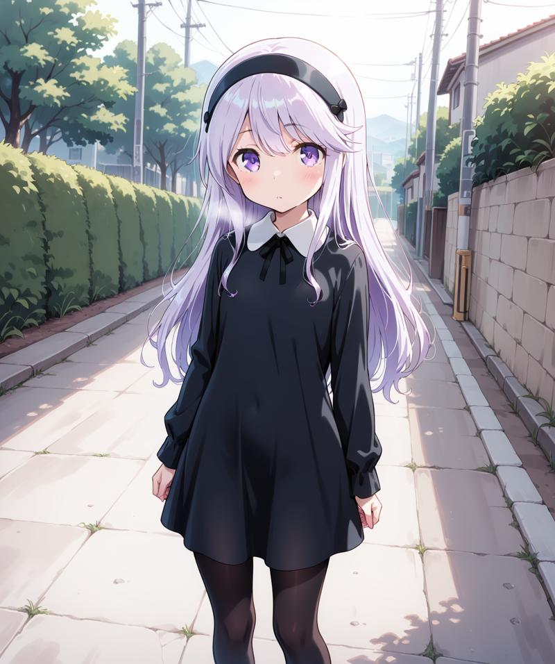 mourning clothes, black hairband, black dress, white collar, black ribbon tie, black tights, black shoes,