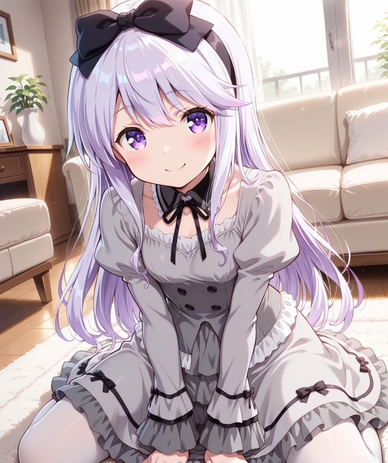 hair bow, gray dress, gothic lolita, juliet sleeves, collar, ribbon tie, white tights, black shoes,