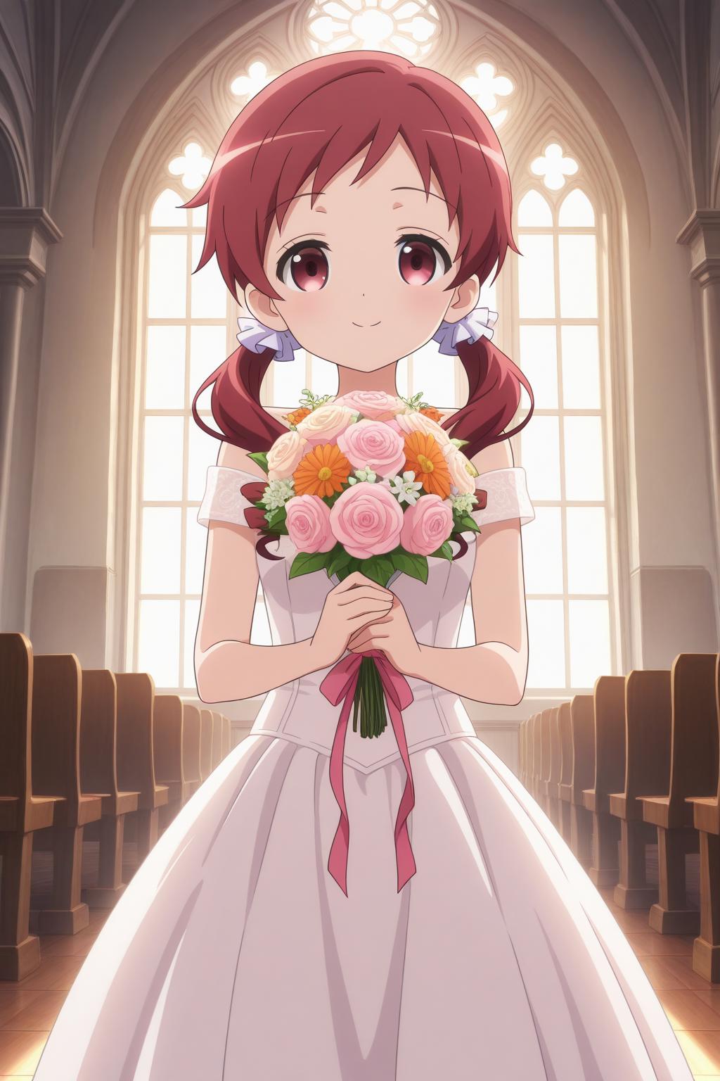 aamegumi, red eyes, red hair, low twintails, white hair scrunchie, hair over shoulder, megumiwork, red bowtie, white dress shirt, pink vest, black skirt, long skirt,