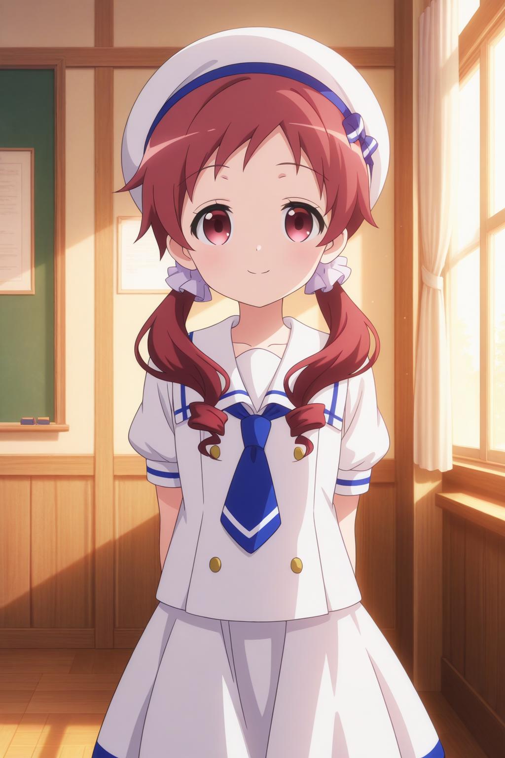 aamegumi, red eyes, red hair, low twintails, white hair scrunchie, hair over shoulder, megumisummer, white beret, white sailor collar, blue neckerchief, white sailor shirt, puffy short sleeves, white skirt, pleated skirt,