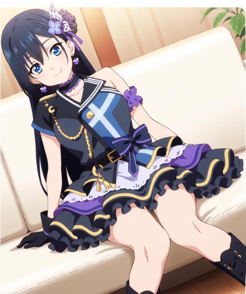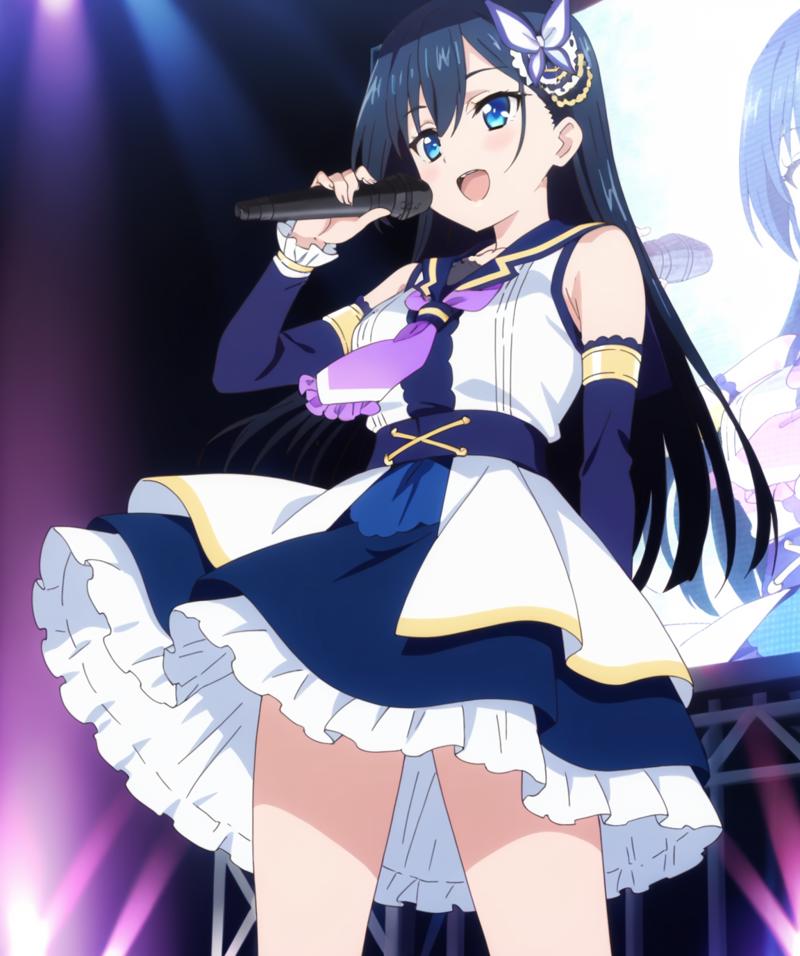 idol costume1, hair ornament, white dress, sleeveless, detached sleeves, blue sailor collar, purple tie, blue belt, blue skirt, blue socks, white shoes,